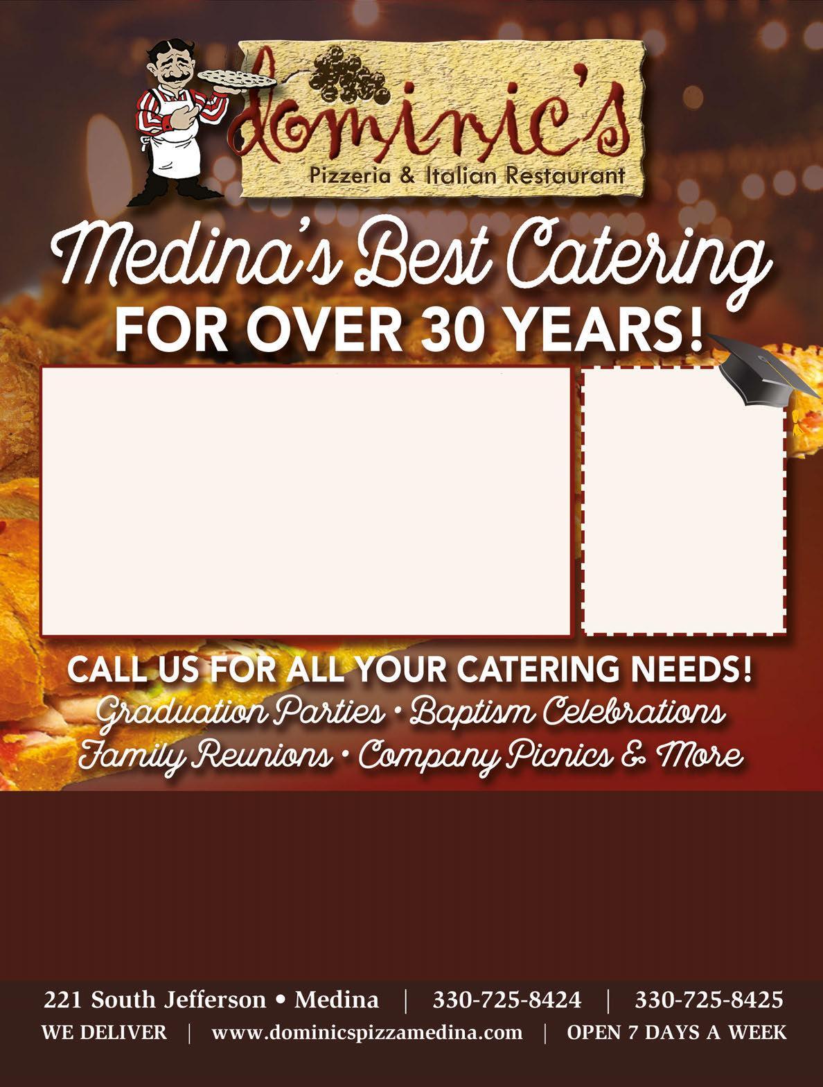 $8.99 Large 1-Item Pizza VALID MONDAY & TUESDAY ONLY FAMILY FEAST Choice of Rigatoni with Meatballs or Chicken Penne Alfredo, 8 Breadsticks, Garden Salad, 2 Liter of Soda $34.99 $2 OFF Any Item Available for DINE-IN ONLY at Dominic’s Italian Restaurant. Not valid for take out, delivery or at JoJo’s Sports Bar. One coupon per table. Expires 7/15/21 $5.00 OFF Any Catering Order Of $100 or More Good only on Catering Menu items. Not good on specials, or any beverage. One coupon per order. Must present coupon. Expires 7/15/21. Not good on specials, combos or any beverage. One coupon per order. Must present coupon. Expires 7/15/21. PICK UP & DELIVERY ONLY NOT FOR DINE-IN Feeds 6-8 People. Expires 7/15/21 Entrees Half Full Rigatoni or Penne $24.99 $37.99 Penne Alfredo $25.99 $39.99 Chicken Penne Alfredo $33.99 $63.99 Homemade Lasagna $30.99 $61.00 Meatballs $1.50 each Sausage & Peppers $33.99 $63.99 Chicken Parmesan $36.99 $67.99 Chicken Marsala $36.99 $67.99 Roast Beef with Gravy $44.99 $73.99 Mac n