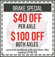 $5.00 OFF Any Catering Order Of $100 or More Good only on Catering Menu items. Not good on specials, or any beverage. One coupon per order. Must present coupon. Expires 7/15/22. WEDNESDAY SPECIAL 8pc Chicken Dinner for $16.99 8pcs of our Juicy Fried Chicken, JoJo Potatoes, Coleslaw & Dinner Rolls. Feeds up to 4 people Not good on specials, or any beverage. One coupon per order. Must present coupon. Expires 7/15/22. SAVE $20 OFF SAVE $15.00 DIAGNOSTIC TESTING Must present coupon prior to service. Cannot be combined with any other offer or coupon. Expires 7/15/22 Must present coupon prior to service. Cannot be combined with any other offer or coupon. Expires 7/15/22 Must present coupon prior to service. Cannot be combined with any other offer or coupon. Expires 7/15/22 Must present coupon prior to service. Cannot be combined with any other offer or coupon. Expires 7/15/22 2022 SERVICE SPECIAL $10 OFF $100 or More $20 OFF $200 or More $30 OFF $300 or More SAVE UP TO $20 on ANY BRAKE SERVICE ($10 per Axle) ON ANY AIR CONDITIONING SERVICE