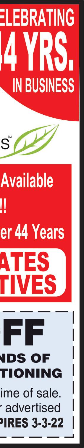 FREE Inspection of Current Blinds FREE Cordless Lift on Alta Honeycomb Shades Valid with coupon only. Exp. 3/5/22. Buy 2 Get 1 FREE or 30% OFF Each Window Treatment Excludes Roman Shades, Draperies & Shutters. Valid with coupon only. Exp. 3/5/22. 10% OFF Alta Faux Wood Blinds & Roller Shades May be combined with 30% Off. Valid with coupon only. Exp. 3/5/22. www.clemasonry.com Serving All of Northeast Ohio RESIDENTIAL & COMMERCIAL Veteran Owned • CHIMNEY REPAIR • STEP REPAIR • TUCK POINTING • STONE VENEER • CONCRETE • FIREPLACES • RETAINING WALLS $250 OFF MASONRY WORK ON ANY JOB OVER $2500 With Coupon. With Coupon. With Coupon. $50 OFF MASONRY WORK ON ANY JOB OVER $500 FREE WATERPROOFING WITH ANY PURCHASE Don’t let Winter stop you from your masonry project... We use additives that cure the mortar in cold weather and we have canopies with big commercial heaters. Call Today!
