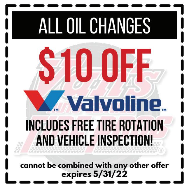 SERVICE SAVINGS Most Vehicles. Coupon Required. Not valid with any other offers. Expires5/26/22 $10 OFF $3 0 OFF $2 0 OFF (Excludes Tire Purchase) Any Service Over $150 Any Service Over $350 Any Service Over $250 Auto & Tire Service PAIS 440-322-1327 100 Broad Street•Elyria Hours: M-F 7AM-6PM WE WILL MEET OR BEAT ANYBODY’S PRICE! Federated Car Care YOUR LOCALLY OWNED & OPERATED REPAIR SHOP Online at JohnPaisAutoService Most cars & light trucks. With coupon. Not valid with other offers. Some restrictions may apply. Expires5/26/22 •Tire Tread Depth & Pressure •Rotate Tires •Brake Inspection •Maintenance Updates SPRING SERVICE SPECIAL $ 34 95 $ 49 95 SYNTHETIC BLEND FULL SYNTHETIC •Check Air Filter •Test Antifreeze •Check Radiator •Checks Belts, Hoses •Check All Lights •Check Wiper Blades •Check Horn •Oil, Lube & Filter Up to 5 qts oil Lube where applicable •Check All Fluid Levels •Check & Test Battery •Check Battery Terminals REBATES ON SELECT BRANDS