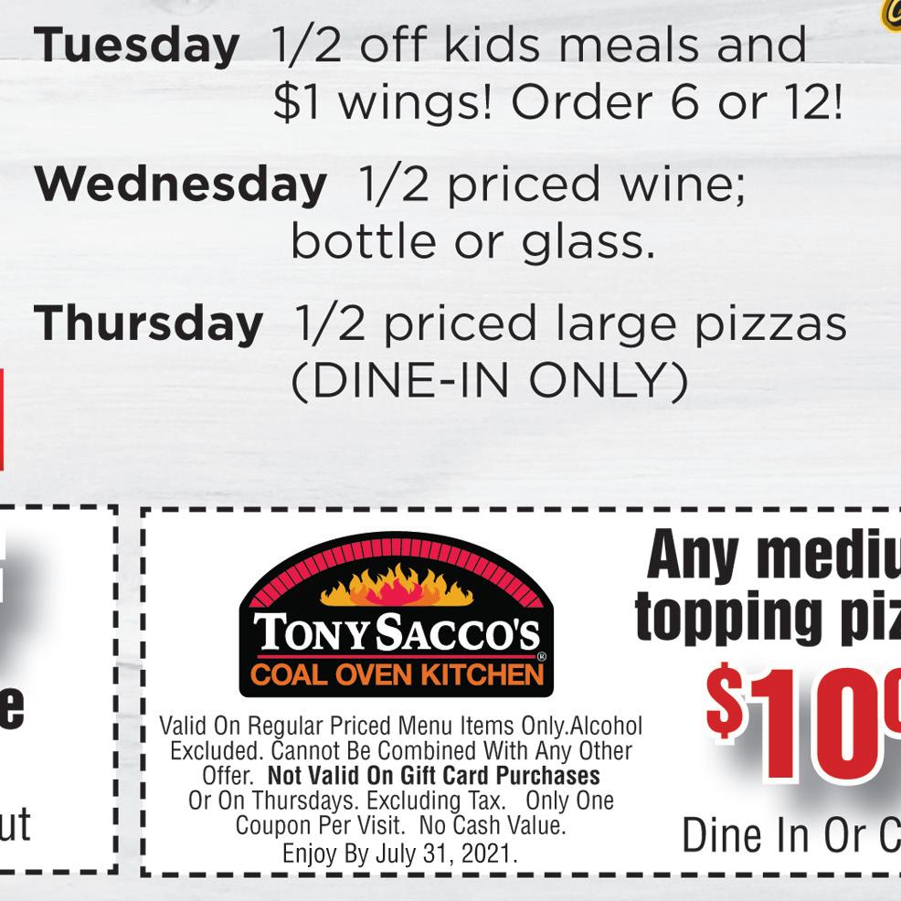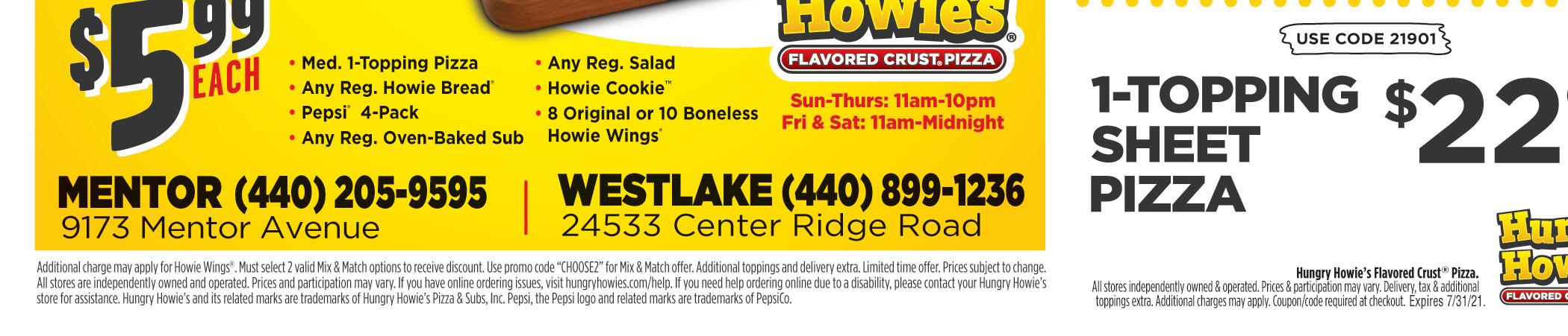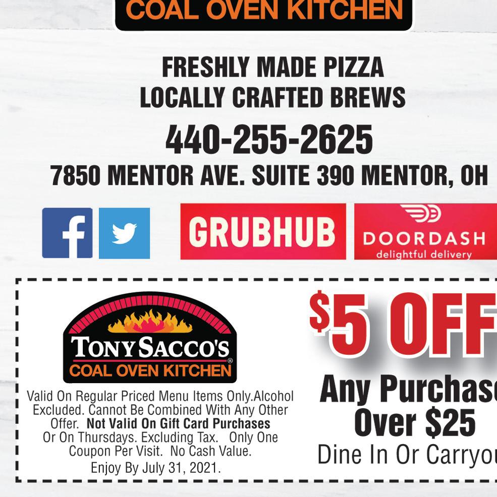 SHOP LOCALLY $$$ SAVE LOCALLY™ • VISIT www.TownMoneySaver.com FOR MORE COUPON SAVINGS! Official Site! 7883 MUNSON ROAD • 257-9700 ALL YOU CAN EAT FRIDAY PERCH DINNER THURS. 11-3PM Buy One Lunch Get one Half Price OF EQUAL OR LESSER VALUE. DINE-IN ONLY. NOT VALID WITH ANY OTHER OFFER. EXPIRES 7/29/21 With the Purchase of 2 Dinner Entrees Monday thru Sunday EXCLUDES COMBO PLATTER. DINE-IN ONLY. NOT VALID WITH ANY OTHER OFFER. EXPIRES 7/29/21 FREE APPETIZER HALF PRICE LUNCH TAKEOUT & CURBSIDE SERVICE Open 11am Daily. Happy Birthday Spuddy & Kali! GEORGE KOENIG III MEMORIAL GOLF OUTING Wed. Aug. 11th Sign-up your team now! Mon: 4-9p • Tues-Thurs: 11a-10p • Fri: 11a-Midnight • Sat: 11a-11p Sun: 1-9p 7875 MUNSON ROAD • Mentor-on-the-Lake 440-209-1491 ® Mastercard VISA TAKE-OUT & DELIVERY • MINIMUM $10 ORDER FOR DELIVERY EVERYDAY FAMILY SPECIALS 18” XL One Topping Pizza, Appetizer, Large Dinner Salad & 2-Liter Soda $24 Spaghetti with 8 Meatballs, 8 pcs. Garlic Bread & Large Dinner Salad $22 CATERING AVAILABLE Classic Italian Cuisine Classic Italian Cuisine FAMILY OWNED & OPERATED D A I L Y S P E C I A L S MON: 16” One topping Pizza $9.99 TUES: Two-Topping Calzones $5.00 WED: BOGO Pepperoni Roll (reg. $6.99) THUR: Two 12” Subs $10 (certain restrictions) See our complete menu! www.TheZaShop.com $1695 $500 OFF Any Order of $20 or more at regular menu price ANGIE’S PIZZERIA • 440-209-1491 One Coupon Per Customer. Not valid with any other offers or promotions. Cannot be combined with any other offer. Expires 7-31-21 ANGIE’S PIZZERIA • 440-209-1491 One Coupon Per Customer. Not valid with any other offers or promotions. Cannot be combined with any other offer. Expires 7-31-21 Two 16” Large One Topping Pizzas $22 ANGIE’S PIZZERIA • 440-209-1491 One Coupon Per Customer. Not valid with any other offers or promotions. Cannot be combined with any other offer. Expires 7-31-21 18” XL Two Topping Pizza, & 2-Liter Soda $1000 OFF Any Order of $50 or more at regular menu price ANGIE’S PIZZERIA • 440-209-1491 One Coupon Per Customer. Not valid with any other offers or promotions. Cannot be combined with any other offer. Expires 7-31-21