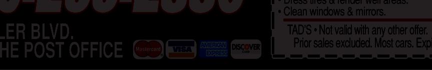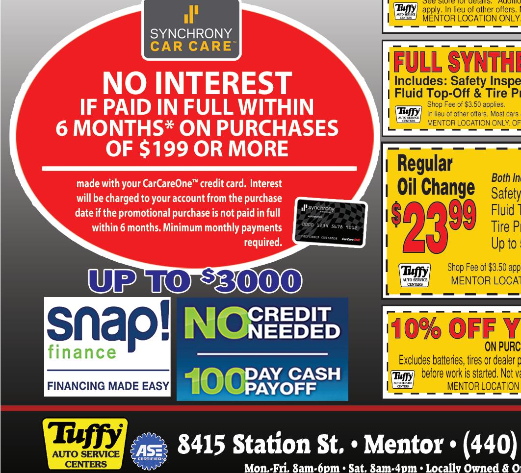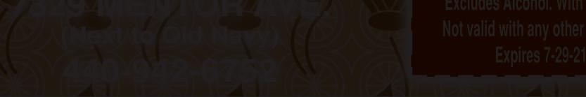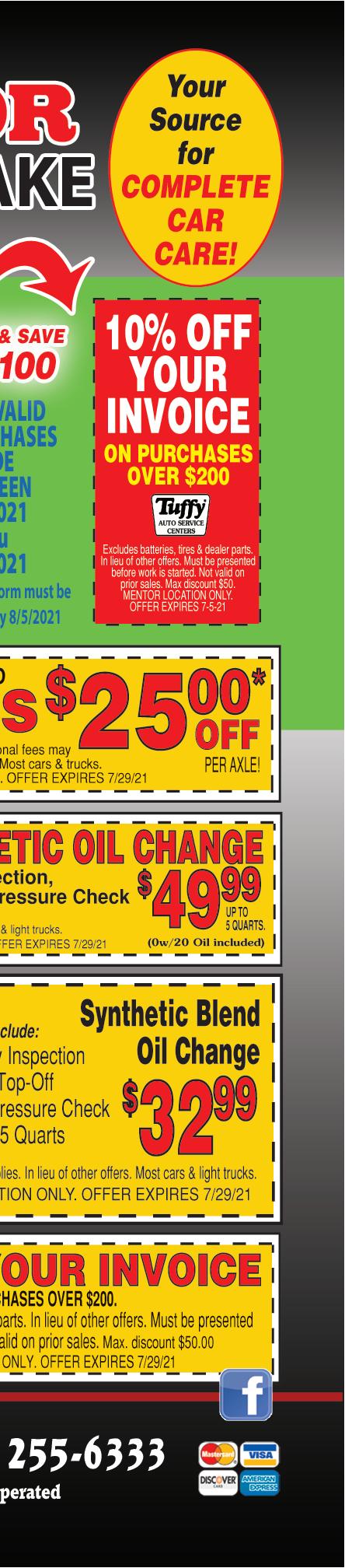 SHOP LOCALLY $$$ SAVE LOCALLY™ • VISIT www.TownMoneySaver.com FOR MORE COUPON SAVINGS! COCOS LOCOS 7501 MENTOR AVE. ACROSS FROM MENTOR TV 440-918-1503 CocosLocosMentor.com PRIVATE PARTY ROOM! with FAJITA BAR for parties of 20 or more! MEXICAN RESTAURANT Buy One Lunch, Get the Second Half Off (lunch menu items 2-6) PITCHER OF MARGARITA $15.99 All Day Fri, Sat, Sun (Lime, on the rocks only) NOW HIRING! $10 OFF Any $50. Food Purchase COCOS-LOCOS. DINE-IN OR CARRY-OUT. Not valid with any other offer. Expires 7-29-21 $5 OFF Any $25. Food Purchase HALF OFF DINNER Buy One Dinner from the Combo Menu, get the Second 1/2 Off COCOS-LOCOS. DINE-IN OR CARRY-OUT. Not valid with any other offer. Expires 7-29-21 COCOS-LOCOS. DINE-IN OR CARRY-OUT. Not valid with any other offer. Expires 7-29-21 $2 OFF Any $10. Food Purchase COCOS-LOCOS. DINE-IN OR CARRY-OUT. Not valid with any other offer. Expires 7-29-21 with the purchase of at least three other entrees. Meal of equal or lesser value. Photo ID required if over 18 years of age. Valid from one day before till one day after birthday. A-1 Maid Service Making Fresh While You Rest! REGULAR OR OCCASIONAL SERVICE 15 YEARS EXPERIENCED & INSURED 440-728-1733 25% Off Your First Service A-1 Maid Service • 440-728-1733 With this coupon. Not valid with other offers. Expires July 29, 2021 RESIDENTIAL • COMMERCIAL • OFFICES • SPECIAL EVENTS • DEEP CLEANS COMPLETE AUTO CARE 7495 Mentor Ave. • Mentor Next to TJ’s Restaurant (440) 255-8875 firestonecompleteautocare.com $50 OFF Per Axle FIRESTONE • Most Vehicles. Cannot combine with other offers. Must present coupon. Exp. 8-7-21 $40 OFF A Set of 4 Firestone Tires PLUS.. $40 OFF Wheel Alignment with purchase of 4 FIRESTONE tires! Cannot combine with other offers. Must present coupon. Exp. 8-7-21 $60 OFF Set of Struts FIRESTONE • Most Vehicles. Cannot combine with other offers. Must present coupon. Exp. 8-7-21 FIRESTONE • Most Vehicles. Cannot combine with other offers. Must present coupon. Exp. 8-7-21 BRAKES $80 OFF STRUTS! A/C PERFORMANCE INSPECTION only $9.99 UP TO SEE STORE FOR DETAILS Wipers, Alignment, Tire Balance, Cabin Filter 10% Off Any Service FIRESTONE • Most Vehicles. Cannot combine with other offers. Must present coupon. Exp. 8-7-21 PICK TWO! BONUS COUPON! $79.99 (reg. $119) (max discount $200) FIRESTONE • Most Vehicles. Cannot combine with other offers. Must present coupon. Exp. 8-7-21