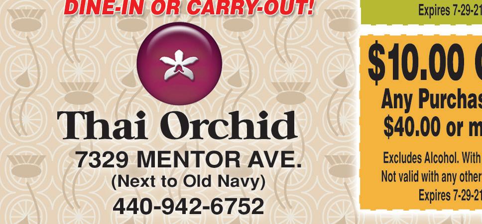 MENTOR July 2021 Shop locally. Save locally. 8310 Tyler Blvd. Just West of RT. 615 Chinese Restaurant Full Service Bar Featuring Our Special Tropical Drinks www.ImperialDragonRestaurant.com Delivery available through UberEats.com Dine-In & Carry-Out Food & Cocktails to go! 974-8838 FAX: 974-1870 ANY CARRY-OUT ORDER of $30 or MORE IMPERIAL DRAGON. VALID ONLY WITH COUPON. NOT VALID WITH ANY OTHER OFFER. EXPIRES 7/29/21 5. OFF 10. OFF THE PURCHASE OF THE PURCHASE OF OR 5. OFF IMPERIAL DRAGON. VALID ONLY WITH COUPON. NOT VALID WITH ANY OTHER OFFER. EXPIRES 7/29/21 ANY CARRY-OUT ORDER of $20 or MORE 3. OFF MPERIAL DRAGON. DINE-IN ONLY. NOT VALID FOR LUNCH. VALID ONLY WITH COUPON. NOT VALID WITH ANY OTHER OFFER. EXPIRES 7/29/21 7601 Mentor Ave. 1/2 mile East of Rt. 306 440-497-5010 SlymansTavern.com Scan code to order online! MONDAY: Closed • TUES – SUNDAY: 11am-8pm Dine-in,Carry-out & Delivery!Dine-in,Carry-out & Delivery! Served 11am-2pm • Dine-In & Carryout FREE KIDS MEAL! with purchase of 2 Sandwiches or 2 Entrees Sun-Thurs after 4pm Dine-In only. Sunday Breakfast Sunday Breakfast Cater ON-SITE OR IN OUR PRIVATE PARTY ROOM! Call for details LET US YOUR EVENT!