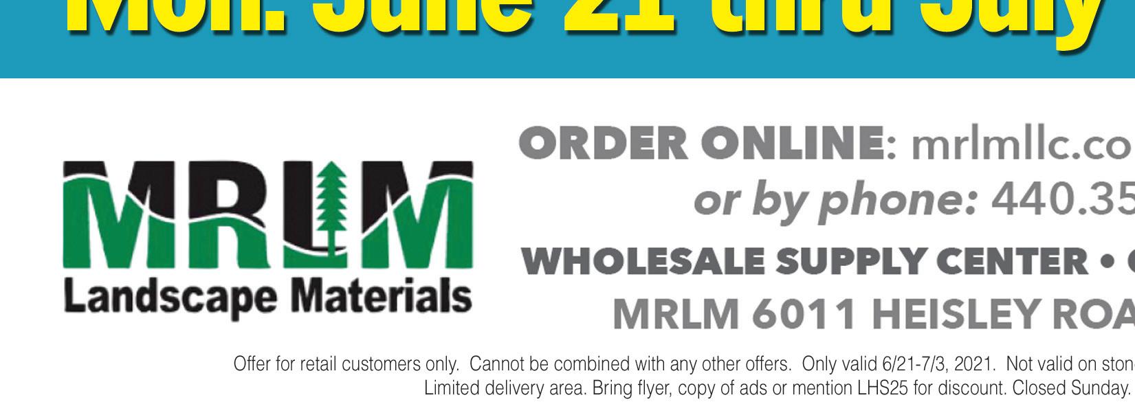 SHOP LOCALLY $$$ SAVE LOCALLY™ • VISIT www.TownMoneySaver.com FOR MORE COUPON SAVINGS! MULCH • TOPSOIL • STONE GRAVEL • COMPOST Mentor • 6011 Heisley Rd. Bedford • 600 Solon Rd. Order Online @ mrlmllc.com Serving Lake, Geauga & Cuyahoga Counties by phone, in person or Text: 440-357-MRLM (6756) Any Delivered Product Ordered Online Restrictions Apply: Retail customers only. Not valid on stone or with any other offer. TMS21. Expires 8/31/21. Restrictions Apply: Retail customers only. Not valid on stone or with any other offer. Limited area on Free Delivery offer. TMS21. Expires 8/31/21. For larger orders of 6 yards or more FREE DELIVERY! 20% OFF