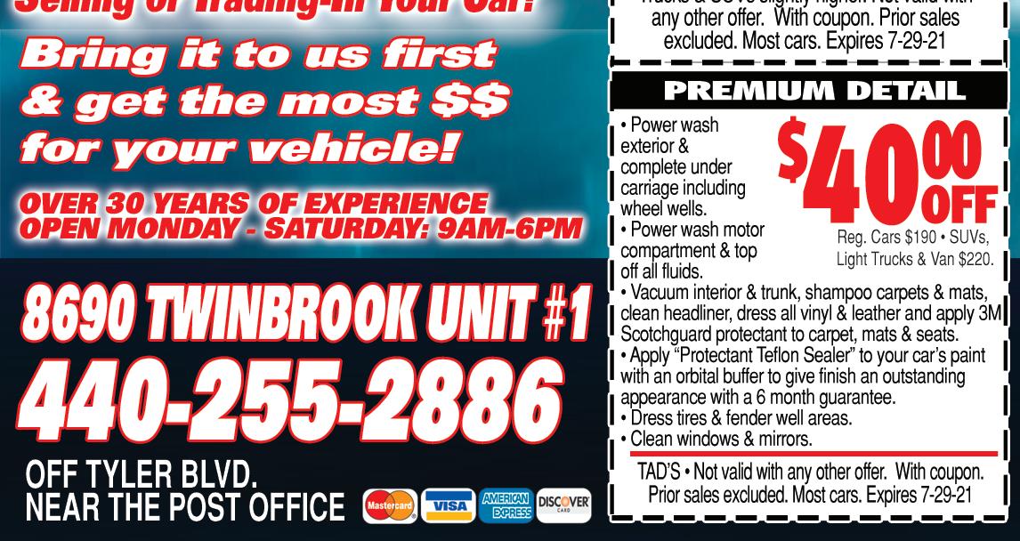 SHOP LOCALLY $$$ SAVE LOCALLY™ • VISIT www.TownMoneySaver.com FOR MORE COUPON SAVINGS! 7361 Center Street 440-290-8300 Pizza • Subs • Wings Salads • Fries • Onion Rings Mozzarella Sticks • Desserts SEE OUR FULL MENU ON FACEBOOK CALL OR ORDER ONLINE: www.gliciouspizza.com Home of the Famous BIG DILL PICKLE PIZZA $5OFF Any order of $25 or more. G-Licious Pizza • 440-290-8300 With this coupon. Can not be combined with other offers. Expires 7-29-21. Use code G1 10%OFF Any order of $10 or more. G-Licious Pizza • 440-290-8300 With this coupon. Can not be combined with other offers. Expires 7-29-21. Use code G2 Thanks for One Great Year! “Titan Your Asphalt” RESIDENTIAL • COMMERCIAL • PRIVATE • INDUSTRIAL • BONDED & INSURED • FREE ESTIMATES SEALCOATING WILL SAVE YOU $$$MONEY AND GIVE YOUR PROPERTY THE ENHANCED APPEARANCE IT DESERVES! NEW PAVING & RESURFACING IS OUR SPECIALITY! ® ® $200 OFF NEW PAVE INSTALLATION NOT VALID WITH ANY OTHER OFFERS OR DISCOUNTS. WITH THIS COUPON. EXPIRES 7-29-21 MINIMUM 1200 SQ. FT. RESURFACING & PARKING LOT MAINTENANCE DRIVEWAY SEALCOATING NOT VALID WITH ANY OTHER OFFERS. MAY NOT BE COMBINED WITH AN ALREADY DISCOUNTED PRICE FOR PREVIOUS WORK. WITH THIS COUPON. EXPIRES 7-29-21 MINIMUM 1,200 SQ. FT. $150 OFF NOT VALID WITH ANY OTHER OFFERS OR DISCOUNTS. WITH THIS COUPON. EXPIRES 7-29-21 $50 OFF MIN. 1,200 SQ.FT. DRIVEWAYS & 15,000 SQ. FT. LOTS • Resurfacing & New Installations • Seal Coating • Hot Asphalt Patching • Complete Line Striping/ADA Compliance • Excavation & Drain Installation • Prepare & Seal Cracks (1/4”+) with Hot Crackfiller • Concrete Crackfilling • Asphalt Curbing 440-974-7040