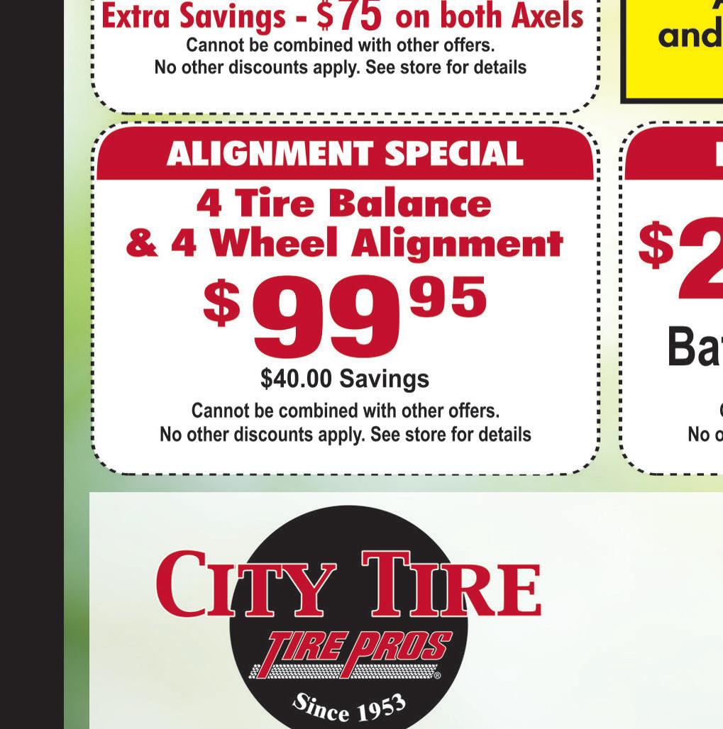 Expires 5-31-22 Expires 5-31-22 Expires 5-31-22 Expires 5-31-22 Expires 5-31-22 Expires 5-31-22 Expires 5-31-22 MACEDONIA 330-468-0521 854 East Aurora Rd | Macedonia ZANESVILLE 740-452-7512 1800 East Pike | COSHOCTON 740-622-7993 110 East Pine St | Coshocton COOLING SERVICE $8995 Cooling System Service PLUS FLUID www.citytirepros.com Most vehicles. May not be combined with any other offer. Most vehicles. May not be combined with any other offer. No other discounts apply. See store for details Expires 5-31-22 OIL CHANGE SPECIAL FREE OIL CHANGE Up to 5 Quarts With a Purchase of 4 Tires and Alignment Minimum purchase of $450 before taxes and fees. Most vehicles. May not be combined with any other offer.