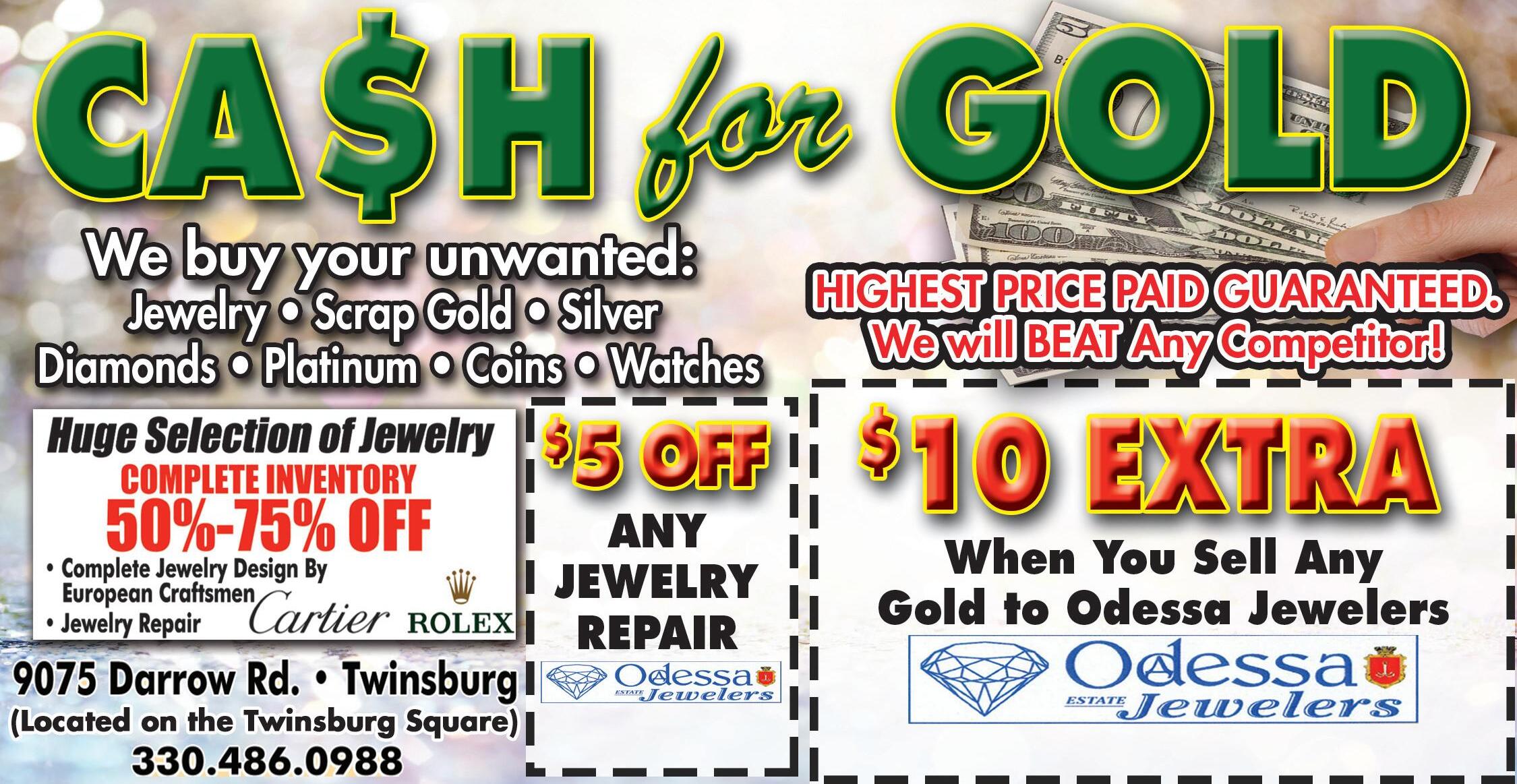 FREE Jewelry Inspection & Cleaning 15% OFF Any Jewelry Repair Must present coupon. Not valid with any other offer. Expires 5/7/22 Limit two items per customer. Must present coupon. Not valid with any other offer. Expires 5/7/22 HOURS: MON, TUES, WED, FRI 10 - 6 • THURS 10 - 7 • SAT 10 - 3 • SUN CLOSED 500 West Aurora Rd. Sagamore Hills | 330-468-0434