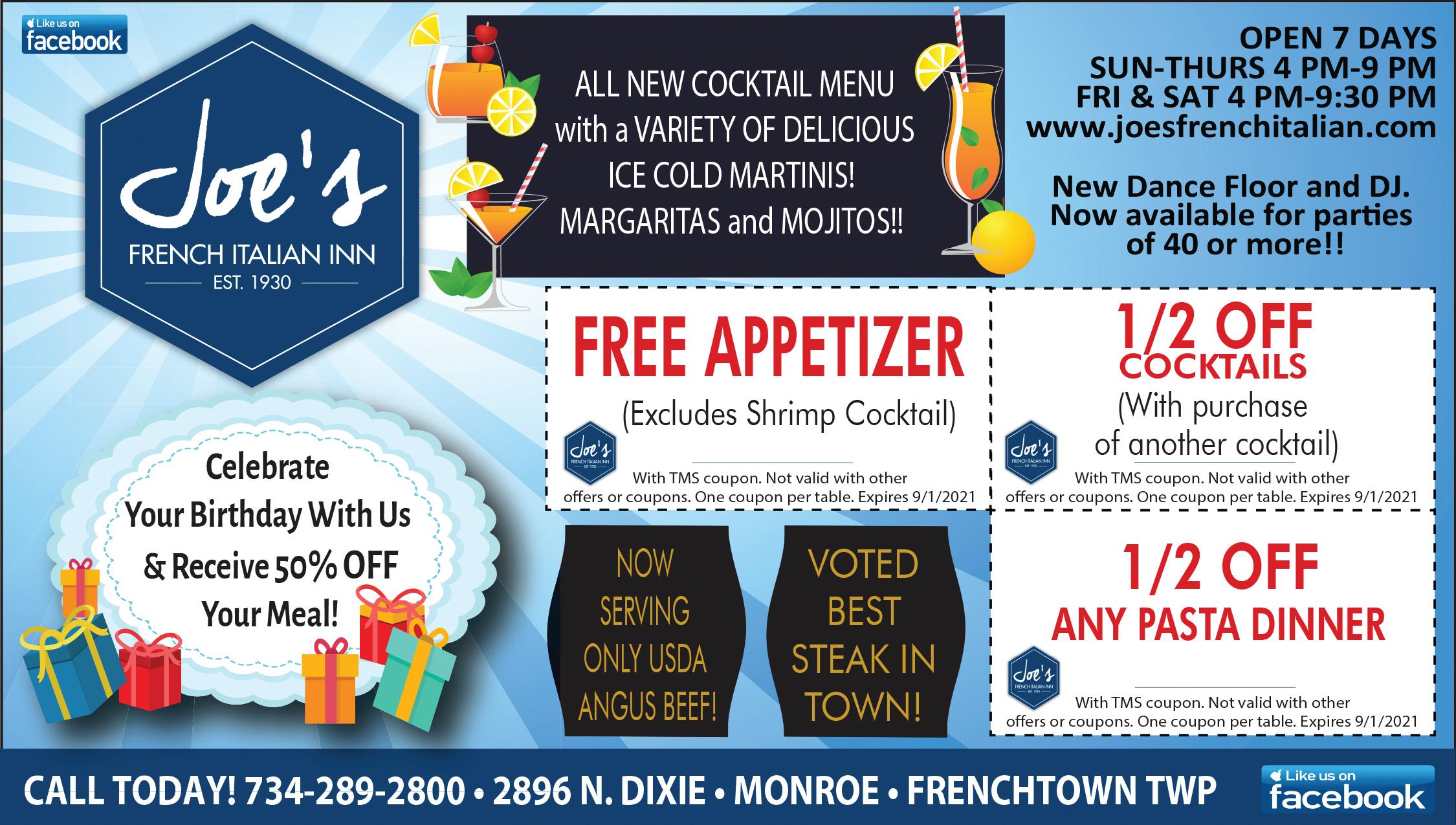 Expires 9/1/2021 With TMS coupon Expires 9/1/2021 Must present coupon at time of service MAX LIFE S emi Synthetic/High Mileage Valvoline Full Synthetic Oil 1 : CLOSED With TMS coupon Expires 9/1/2021 Must present coupon at time of service EVERY RUN LIKE NEW ENGINE SHOULD ™ Automat i c Transmissio n o r Radi a t o r S e r v i c e EVERY RUN LIKE NEW ENGINE SHOULD ™ Family Owned & Operated • Serving Monroe for 25 Years! Mon-Sat • 7am-9pm • Sunday • 8am-3pm Hours ORDER ONLINE @ www.eddysfamilyrestaurant.com Stop in, Relax and Enjoy Breakfast, Lunch & Dinner with Amazing Specials Every day! Mexican Day every Wednesday and Fish Fry Friday!! EAT WHERE GREAT SERVICE, GREAT FOOD AND GREAT PEOPLE COME TOGETHER! FREE POTATO SKINS WITH PURCHASE OF 2 ENTREE’S & 2 BEVERAGES (EXCLUDES HAMBURGER, DINE-IN ONLY, ONE COUPON PER TABLE) FREE KID’S MEAL WITH PURCHASE OF AN ADULT MEAL DINE-IN ONLY• ONE COUPON PER TABLE FREE BEVERAGE WITH PURCHASE OF A DINNER MEAL DINE-IN ONLY• ONE COUPON PER TABLE • VALID 4 PM TO 8 PM Your Favorite Comfort Foods! 1096 N Dixie Hwy, Monroe, Michigan 48162 734-639-2417 Not to be combined with any other offer or special. Must present TMS coupon. Expires 9/1/2021 Not to be combined with any other offer or special. Must present TMS coupon. Expires 9/1/2021 Not to be combined with any other offer or special. Must present TMS coupon. Expires 9/1/2021 N.DIXIEHWY