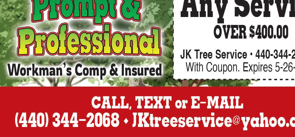 SHOP LOCALLY $$$ SAVE LOCALLY™ • VISIT www.TownMoneySaver.com FOR MORE COUPON SAVINGS! 61 E. WASHINGTON ST. (Painesville-on-the-Square) • 440-392-9292 Entrance on Washington St. across from former Lake East Hospital * MOVING PACKING SUPPLIES & BOXES * THINK SPRING... CLEAR THE CLUTTER FOR A FRESH, NEW FEEL TO YOUR HOME! RESIDENTIAL • COMMERCIAL • STUDENTS WELCOME! www.parkplacestorage.us * All Indoor & Climate Controlled * Resident Manager Lives On-Site * 24 Hr. Video Surveillance Cameras * Personal Entry Codes (Access 6am-10pm) * Month-to-Month Rental * Long-Term Leasing Discounts ASK ABOUT OUR BASEMENT SPECIALS! THINK SPRING SPECIAL! CLEAN & SECURE! PARK PLACE STORAGE • PARTIAL MONTH EXCLUDED. WITH THIS COUPON. NOT VALID WITH OTHER OFFERS. EXPIRES 5-26-22 $25.00 OFF FIRST MONTH’S RENT gutterguard1.com 440-366-0688 INSTALLS OVER EXISTING GUTTERS Always On Time, Friendly and Professional BBB ACCREDITED BUSINESS MADE IN OHIO FREE ESTIMATES•SENIOR DISCOUNTS•VETERAN DISCOUNTS $300 OFF Your Order(Minimumfootage required) Offer expires5-26-22 •Smooth, sloped and self-shedding profile works great for maple spinners, pine needles, roof grit and other small leaves. •Lifetime Performance Warranty •NOT a screen or filter that can clog •Installation Includes: - Gutter & Downspout Cleaning - Resealing seams & Tightening - Proper slope alignment •Proven to handle heavy rains and 110mph winds. •Patented“Bird Guard System”and comes in 14 colors. Heat Available For Open Gutters & Most Existing Gutter Covers. Shop Local And See The Difference Made in USA Serving Northeast Ohio Since 1998 AL ! L ed S l c o re fo en e s B C ’t l o n g o ! D GUTTER HEATING AVAILABLE FOR ICE DAM PROTECTION