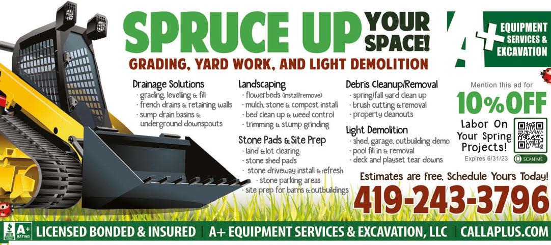1101 Pray Blvd. Waterville, in the Kroger Plaza 567-952-2128 fax 567-952-2129 M-Th 11am-10pm Fri & Sat 11am-10:30pm Sun 11am-9pm BUY ONE GET ONE 1/2 OFF ENTREE Dine-in only • LB717B Excludes Alcohol & Tax La Banda Mexican With TMS coupon. Not valid with any other offer. Exp 6/30/23 $5 OFF $25 - OR$8 OFF $50 Online Order LB717A Excludes Alcohol & Tax La Banda Mexican With TMS coupon. Not valid with any other offer. Exp 6/30/23 Tuesdays KIDS EAT FREE! 1 per adult entree Mondays REG. MARGARITA $425 All Day Mondays 32 OZ. DRAFT BEER IMPORT $4.99 DOMESTIC $3.99 All Day Come Enjoy Our Patio! MARGARITA & FULL BAR now on Sunday! ORDER ONLINE labandamexicangrill.com Sunday, June 18 WE DO Installation & Delivery for all our products! Mon & Tues 11-5 Wed closed Thurs 11-6 Fri 11-5 Sat 10-4 Sun 12-4 Financing Available 7965 W. Central Ave. Sylvania/Toledo Central Ave. between King Rd. & Centennial Rd. 419-517-4485 playgroundworldtoledo.com Springfree TRAMPOLINES 35% off ALL MODELS 20 Year Anniversary Sale 13x13 Square Reg. $2,499 Sale Price $1,624 11x11 Square Reg. $1,999 Sale Price $1,299 8x13 Oval Reg. $1,799 Sale Price $1169 8x11 Oval Reg. $1,499 Sale Price $974 10’ Round Reg. $1,499 Sale Price $974 PLAYGROUND WORLD With TMS coupon. No other discounts apply. Not valid on previous purchases. Exp. 7/01/23 Goalrilla BASKETBALL HOOPS $150 off ALL INSTALLATIONS PLAYGROUND WORLD With TMS coupon. No other discounts apply. Not valid on previous purchases. Exp. 7/01/23 Goalsetter BASKETBALL HOOPS $500 off All American Sale MSRP of All American Model Plus $150 Off All Installations PLAYGROUND WORLD With TMS coupon. No other discounts apply. Not valid on previous purchases. Exp. 7/01/23 MSRP $2,599.99 Sale Price $2,099.99 PLAYSETS • BASKETBALL HOOPS • TRAMPOLINES Woodplay PLAYSETS plus 10% OFF FREE Installation/Delivery (all new Woodplay orders) PLAYGROUND WORLD With TMS coupon. No other discounts apply. Not valid on previous purchases. Exp. 7/01/23