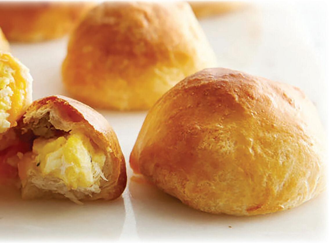 Separate each biscuit in half. Press each into a 4-inch round. Spoon 1 heaping tablespoon full of each eggs, meat & cheese onto center of each round. Gently fold edges up and over lling; pinch to seal. In small bowl, make egg wash by mixing remaining egg and water. Brush on biscuits on all sides. Bake at 350o 15-18 minutes, until golden brown Tip: Also works great in an Air-Fryer!