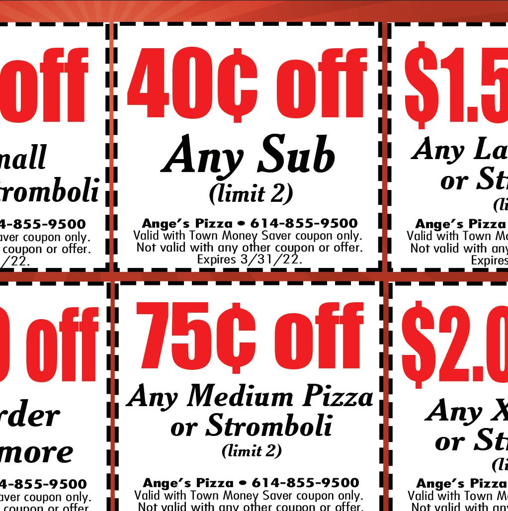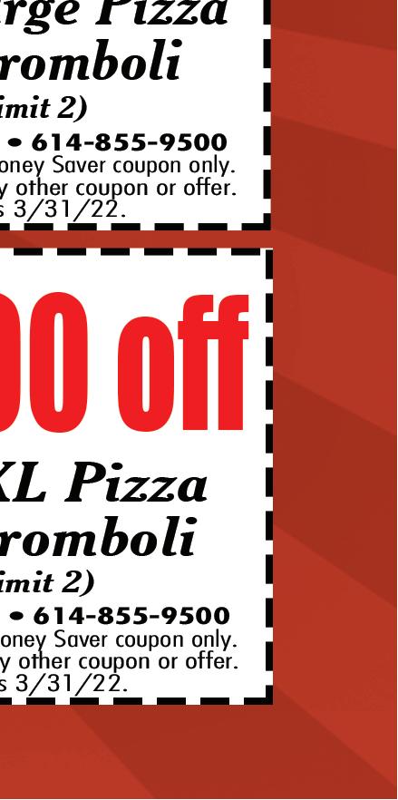 614-855-5858 4926 Morse Rd. Columbus OPEN FOR CARRY OUT & DELIVERY Temporary Hours: Sun-Thurs 11am-8pm; Fri & Sat 11am-9pm With this Town Money Saver coupon only. Cannot be combined with any other offers. Must present coupon. Expires 3/2/22. TMS With this Town Money Saver coupon only. Cannot be combined with any other offers. Must present coupon. Expires 3/2/22. TMS With this Town Money Saver coupon only. Cannot be combined with any other offers. Must present coupon. Expires 3/2/22. TMS With this Town Money Saver coupon only. Cannot be combined with any other offers. Must present coupon. Expires 3/2/22. TMS With this Town Money Saver coupon only. Cannot be combined with any other offers. Must present coupon. Expires 3/2/22. TMS $2 OFF Item Pizza $4 OFF 20% OFF Any order $5 OFF FREE Garlic Cheese Bread with any 16” Pizza We deliver with Just click on deliver on our website We Can Make Individual Pizzas & Box Lunches For Your Catering Event! $5 OFF Any Food Order of $30 or More $10 OFF Any Food Order of $50 or More 50% OFF Buy 1 Entrée at regular price, get 2nd entrée 50% Off Dine In Only. Not valid with any other coupon. Not valid on Thursdays. Expires 3/2/22. Dine In Only. Not valid with any other coupon. Not valid on Thursdays. Expires 3/2/22. (Equal or lesser value) Excludes all Fajitas and Steak items. Dine In Only. Not valid with any other coupon. Not valid on Thursdays. Expires 3/2/22. Join Us For Our Valentine’s Day Specials!!