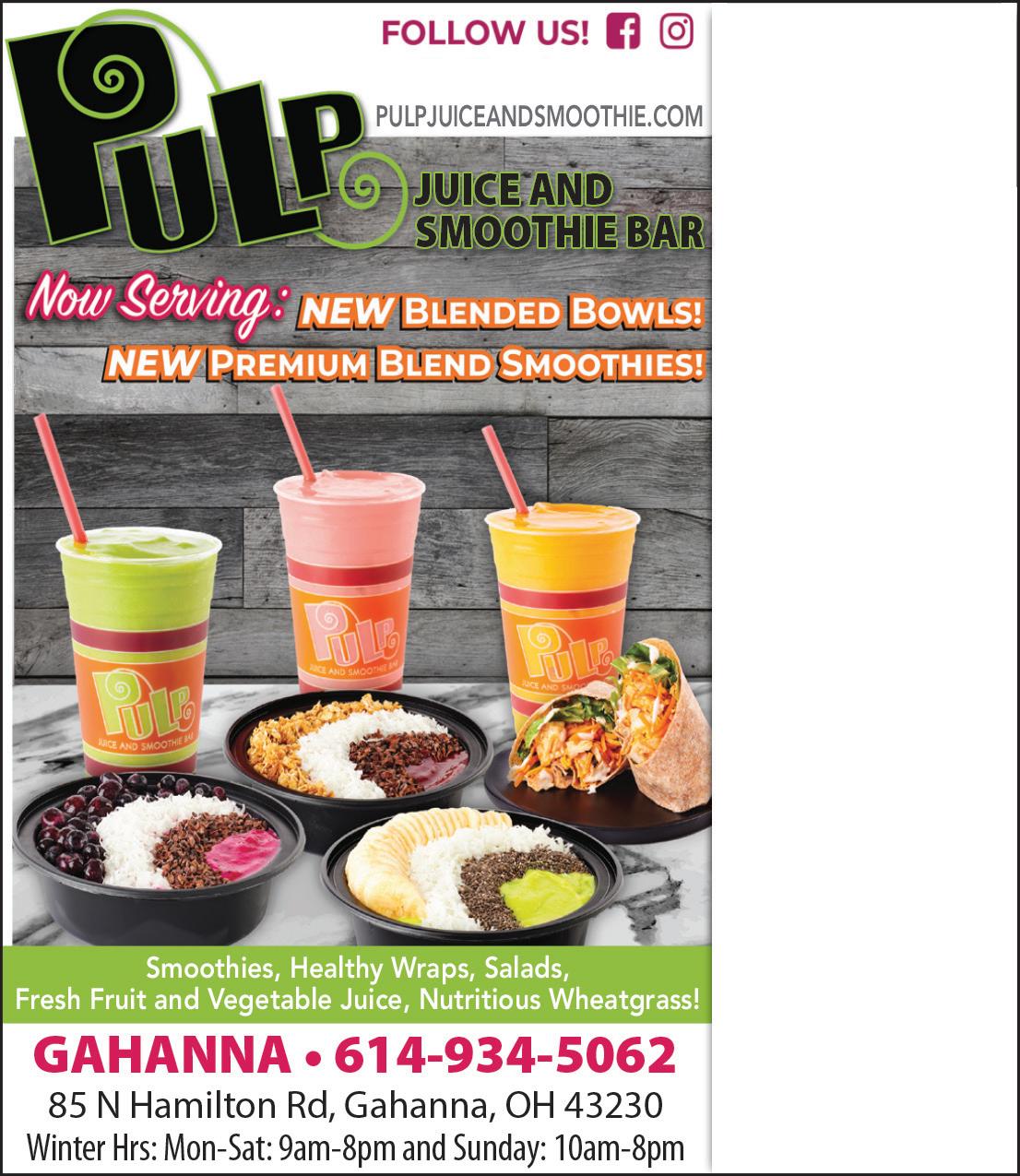 GAHANNA Published By Town Money Saver, Inc. Corporate Office • PO Box 356 • Lucas, OH 44843 © 2018 TMS Franchising, Inc. All rights reserved. For advertising information, call Sharon 614-679-8160 NEXT ISSUE IN HOMES: March 3, 2022 ADVERTISING DEADLINE: February 16, 2022 PRSRT STD ECRWSS U.S. POSTAGE PAID Town Money Saver, Inc. townmoneysaver.com Buy 2 Air Park passes and get one FREE Limit one per person. Valid during open sessions. Expires 3/2/22. $2 OFF ANY JUICE OR SMOOTHIE $2 OFF ANY BOWL OR WRAP Valid at Gahanna location only. One coupon per customer per visit. Offers cannot be combined. Must present coupon at time of purchase. Excludes shots. Expires 3/2/22. Valid at Gahanna location only. One coupon per customer per visit. Offers cannot be combined. Must present coupon at time of purchase. Expires 3/2/22.