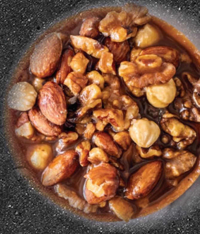Preheat the oven to 350 degrees. Combine nuts & spread them on a sheet pan, roast for 7 minutes, until they become fragrant. Set aside to cool. Place sugar & ¼ cup of water in a medium (10”) sauté pan and mix with a fork until the sugar is moistened. Cook over medium-high heat until the sugar melts—from this point on, don’t stir the caramel, swirl the pan! Don’t worry—the mixture may look as though it’s crystallizing. Continue to cook 5-10 min., until mixture becomes clear golden brown, swirling the pan constantly at the end. (Careful—the caramel is very hot!) Off the heat, quickly add the vanilla (it will bubble up!) and swirl the pan to combine. Working quickly (the caramel will continue to cook in the pan), add the nuts and the kosher salt and toss with 2 large spoons until the nuts are coated.