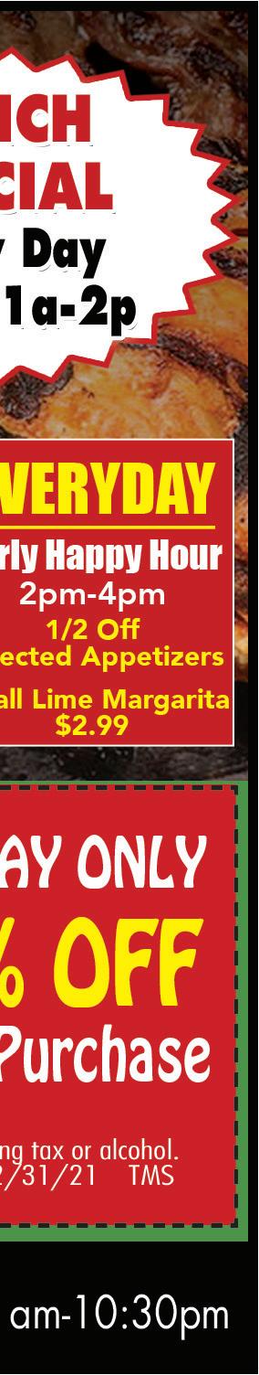 PICKERINGTON Published By Town Money Saver, Inc. Corporate Office • PO Box 356 • Lucas, OH 44843 © 2021 TMS Franchising, Inc. All rights reserved. For advertising information, call 614-900-4256 NEXT ISSUE IN HOMES: December 30, 2021 ADVERTISING DEADLINE: December 17, 2021 POSTAL CUSTOMER PRSRT STD ECRWSS U.S. POSTAGE PAID Town Money Saver, Inc. townmoneysaver.com TRAMPOLINES 3 FOAM PITS NINJA COURSE DODGE BALL TODDLER AREA PARTY ROOMS GET OUT. GET ACTIVE. GET AIR. CLUB AIR FRI & SAT 8PM – 10PM 1075 Hill Rd N • Pickerington • 614-490-1286 Get coupons/deals online at... GetAirPickerington.com FREE HOUR BUY 1 HOUR, GET 2ND HOUR FREE (SAME PERSON/SAME DAY) With coupon. Not valid with other o ers. Not valid on holidays and school holidays. Limited to ONE per household. One time use. Valid for one person only, please. Expires 12/31/21 FREE HOUR BUY 1 HOUR, GET 2ND HOUR FREE (SAME PERSON/SAME DAY) With coupon. Not valid with other o ers. Not valid on holidays and school holidays. Limited to ONE per household. One time use. Valid for one person only, please. Expires 12/31/21 FREE 2 HOURS (LIMIT ONE PER TRANSACTION) With coupon. Not valid with other o ers. Not valid on holidays and school holidays. Limited to ONE per household. One time use. Valid for one person only, please. Expires 12/31/21 $50 OFF YOUR NEXT PARTY WHEN YOU BOOK A PARTY WITH 10 OR MORE JUMPERS With coupon. Not valid with other o ers. Not valid on holidays and school holidays. Limited to ONE per household. One time use. Valid for one party only, please. Expires 12/31/21 GIVE THE GIFT OF FUN! GIVE THE GIFT OF FUN! Gift Card SALE Going on NOW!