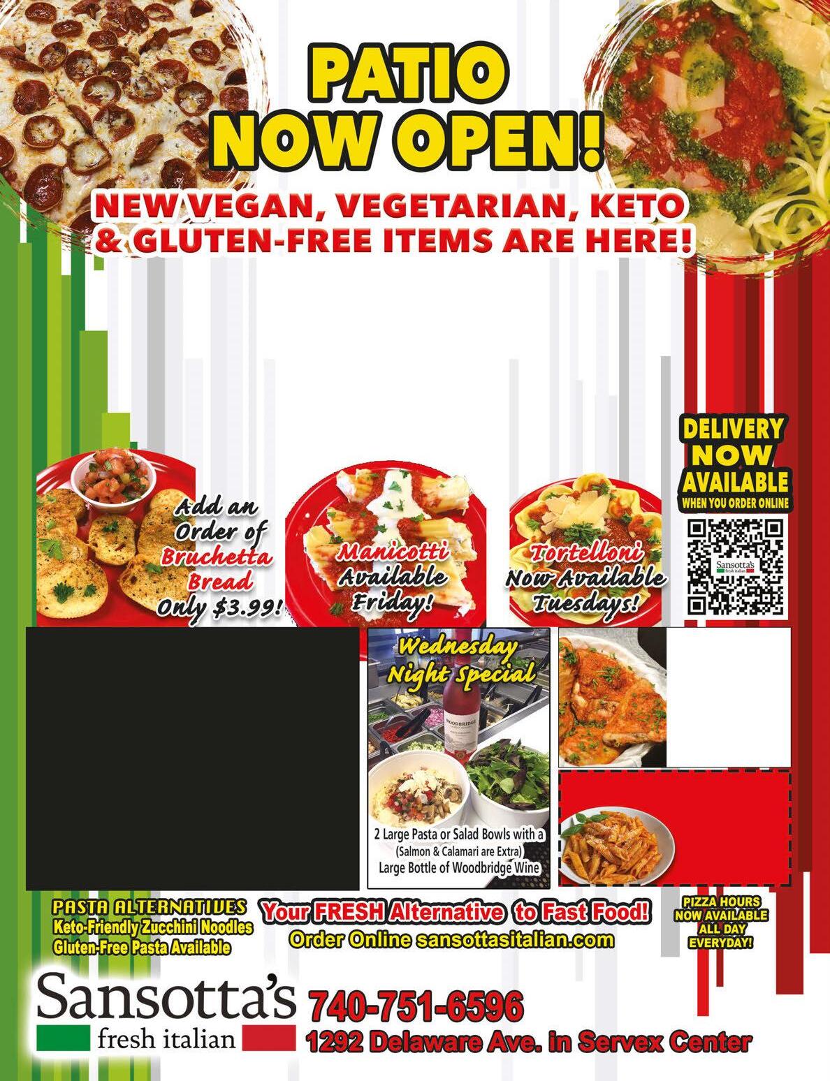 $1.00 OFF Any Pasta Bowl or Salad Must present coupon. Not valid with other offers. Expires 5/15/21. Daily Specials Monday Homemade Lasagna $925 Tuesday Philly Cheese Steak $850 Tortelloni-Organic Blend of Cheese $895 & Vegetables Thursday 4pc Family Recipe Italian Baked Chicken $499 (Breast, Thigh, Wing & Leg) Friday Manicotti $995 Saturday Ravioli 10pc ALL DAY $799 Pick Your Sauce, Pick Your Toppings Meat is Extra Fri./Sat. ALL DAY Bud & Bud Light $150 Fri./Sat./Sun. 14” Cheese Pizza $800 14” Toppings ea. $175 10” Cheese Pizza $600 10” Toppings ea. $125 Sunday Homemade Beef and Noodles over Mashed Potatoes PIZZA ALL DAY EVERYDAY! Gluten Free & Cauliflower Crust Now Available! WE CATER! facebook.com/SansottasItalian Sansottasfreshitalian@yahoo.com Catering Always Available Every Thursday is Family Recipe Italian Baked Chicken 4pc only $4.99 (breast, thigh, wing & leg) NEW 10” Vegan Pizza $12.00 Our famous pizza crust topped with tangy pizza sauce and vegan mozzarella. Cooked up golden brown. Additional toppings $1.25 each Vegan Vegetable Bowl $6.49 Cilantro lime riced cauliflower or zucchini noodles topped with our quick tomato sauce* and your choice of vegetables. Gluten Free Cheese Pizza $8.00 Cauliflower based gluten free crust with our famous pizza sauce and house cheese blend. Additional toppings $1.75 each We also offer a variety of keto friendly options using our salad menu and broad choices of vegetables. Gluten free pasta, cilantro lime riced cauliflower, or zucchini all available to substitute in any pasta bowl for additional $2.00 *We now use a blend of rice bran, extra virgin olive, avocado, and grapeseed oil to make our quick tomato sauce. NOW AVAILABLE 48oz Cartons of Homemade Ice Cream Pints of Gelato Ice Cream Sandwiches & Fudge