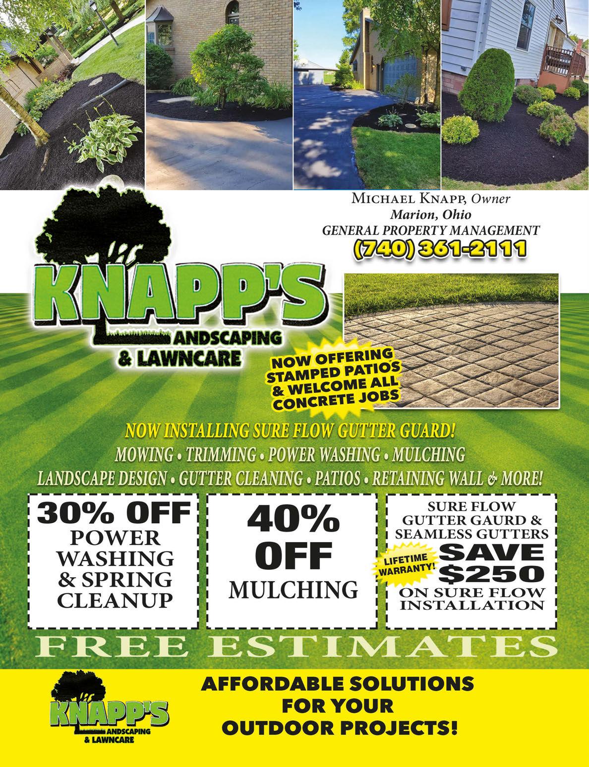 With coupon. Expires 5/15/21. ALL YOU CAN BOWL FOR $8 5PM-8PM $2 SPECIALS “Quality Matters” Phil Brugger, Owner 2035 Agosta-Meeker Rd New Bloomington, Ohio 43341 740-361-1495 phil@bruggerqualityconstruction.com Check Out Our Timber Tech Display at Brugger Quality Construction Proudly Installing Timber Tech Decks! NOW BOOKING FOR SUMMER! OUTDOOR LIVING SPACE VIRTUALLY MAINTENANCE FREE HELP WANTED 4054 LaRue Green Camp Road Marion, Ohio 43302 LAWN MOWING SHRUB TRIMMING LEAF REMOVAL • LAWN ROLLING GARDEN TILLING BED EDGING • SPRING CLEAN UP EMERGENCY MOW SERVICE FREE ESTIMATES Bob Clunk (740) 361-6903 Leo Buyer (740) 341-3017 WE ACCEPT ALL MAJOR CREDIT CARDS