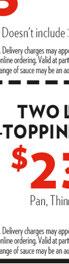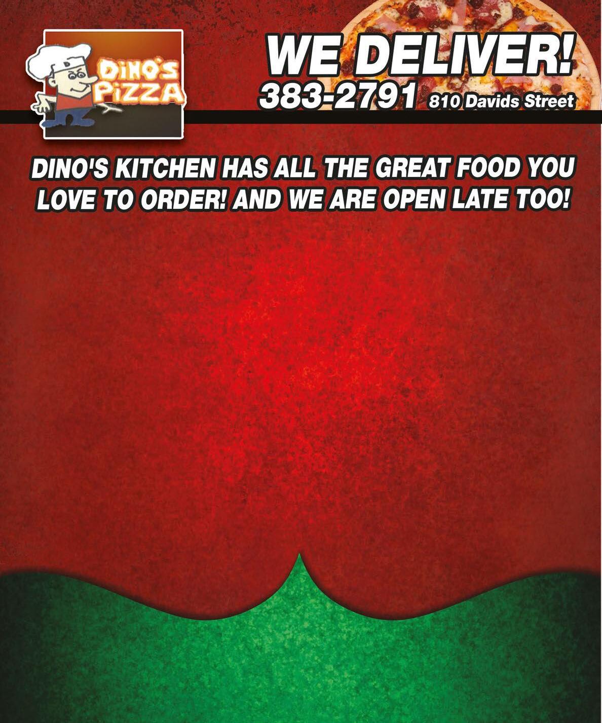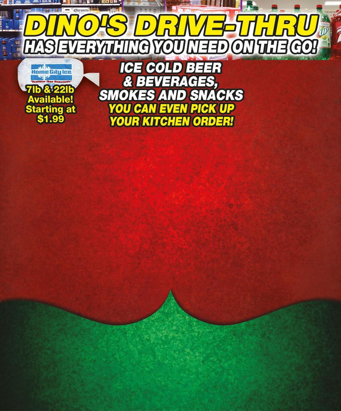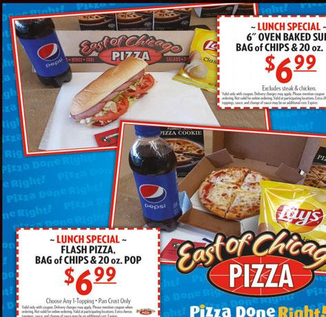 In Town Delivery $5 • Free In Town Delivery on Food Orders Over $35 Delivery Available 4pm-12am Monday - Sunday 2pm - Midnight Dine-In • Carry-Out • Drive-Thru • 810 Davids Street • 740-383-2791 Monday - Sunday 2pm - Midnight 18” 1-Item Pizza Only $999 Must Present Coupon. Expires 1/20/22 60 Pc. Snack Bucket Chicken Fingers, Mushrooms, Onion Rings, Corn Dogs, Pepperoni Sticks, Mozzarella Sticks, Assorted Veggies $2599 or 30 Pc. $1499 Must Present Coupon. Expires 1/20/22 20 Pc. Walleye Bucket With French Fries, Breadsticks and Choice of Cole Slaw, Baked Beans or Macaroni Salad Only $2499 Must Present Coupon. Expires 1/20/22 16” Super Sub Your Choice: Pizza, Italian, Ham, Turkey 1 Only $849 2 Only $1499 Must Present Coupon. Expires 1/20/22 20 Boneless Chicken Wings Your Choice: Regular, BBQ or Hot Only $1399 10 Pc. $6.99 Must Present Coupon. Expires 1/20/22 Pizza Party Pack Giant 18” Pepperoni Pizza, 6 Chicken Wings (Your choice: hot, bbq or original) 6 Breadsticks (Choice of ranch dip or cocktail sauce) 1 lb of Macaroni Salad or Cole Slaw Only $2499 Must Present Coupon. Expires 1/20/22 Lasagna or Spaghetti Dinner With Salad and Garlic Bread Only $599 Must Present Coupon. Expires 1/20/22 Super Special Large Pizza With Your Choice of 3 Toppings (excludes extra cheese) Only $899 Must Present Coupon. Expires 1/20/22 10 Chars or Shredded Chicken or BBQ Pork or Sloppy Joe with Fries Only $2199 Must Present Coupon. Expires 1/20/22 We Accept In Store Only No Checks On Delivery LUNCH MEAT & CHEESE SPECIAL! Colby or Colby Jack 3.99/lb Cooked Ham $3.49/lb Limit 3 lbs. Valid with coupon only. Expires 1/20/22 Large Deluxe Salads Your Choice Mix & Match Chef Loaded or Taco Loaded 1 Only $799 2 Only $1399 Must Present Coupon. Expires 1/20/22 2 Large Cheese Pizzas $11.99 2 Large Cheese Pizzas w/1 Item $13.99 2 Large Cheese Pizzas w/2 Item 15. 9 2 Large Five Item Deluxe Pizzas 1 . 9 EVERYDAY BUY 2 SPECIALS! EVERYDAY BUY 2 SPECIALS!
