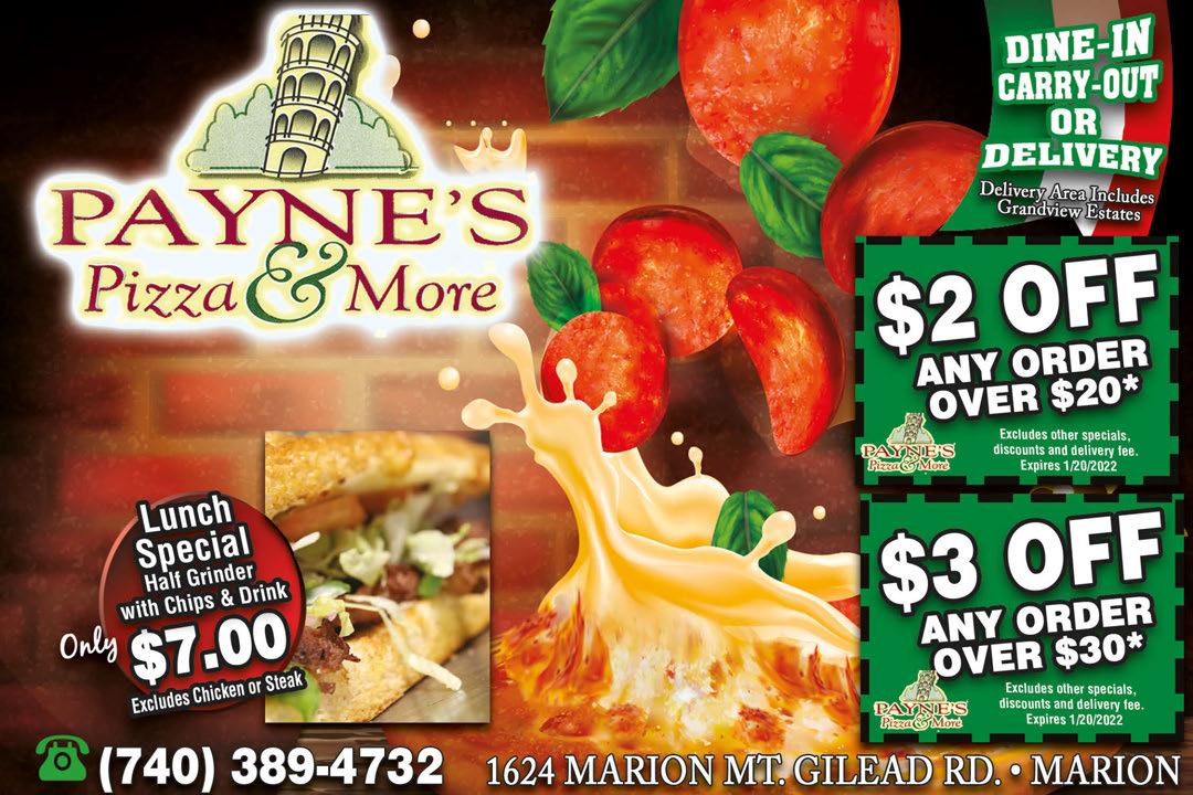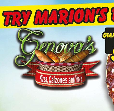 Pick up or delivery 740-387-4992 698 RICHMOND AVE. MARION, OH $2 OFF 19” Giant Super Supreme Expires 1/20/22 Our biggest pizza yet. Ten, count’em ten toppings all piled high and to perfection. Pepperoni, Sausage, Ham, Bacon, Onions, Mushrooms, Black Olives, Green Olives, Mild Pepper Rings and Cheese. ASK ABOUT OUR DESSERTS! FULL MENU ON FB SCAN HERE Expires 1/20/22 Expires 1/20/22 2 - 9” Pizza Subs $10.99 2 - 1 Topping 14” Pizzas $19.99 Gift Certificates Available Gift Cards Available!