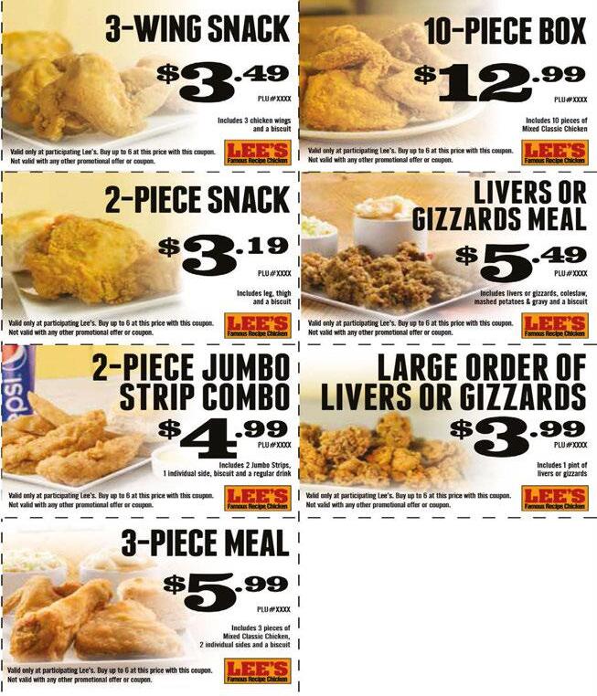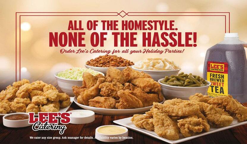 Expires 1/20/22. Expires 1/20/22. Expires 1/20/22. Expires 1/20/22. Expires 1/20/22. 571 E. Center St. • Marion, OH 740-387-3277 **special offers are subject to change or cancellation at any time. $26.99 PLUS TAX NOW HIRING UP TO $13 AN HOUR! SHREDDED CHICKEN SANDWICH WITH 1 SIDE ITEM $3 Valid only at participating Lee’s. Buy up to 4 at this price with this coupon. Not valid with any other promotional offer of coupon. Expires 1/20/22. LIMIT 4 6. Valid only at participating Lee’s. Buy up to 6 at this price with this coupon. Not valid with any other promotional offer of coupon. Expires 1/20/22. HOMESTYLE BOWL COMBO $5.79