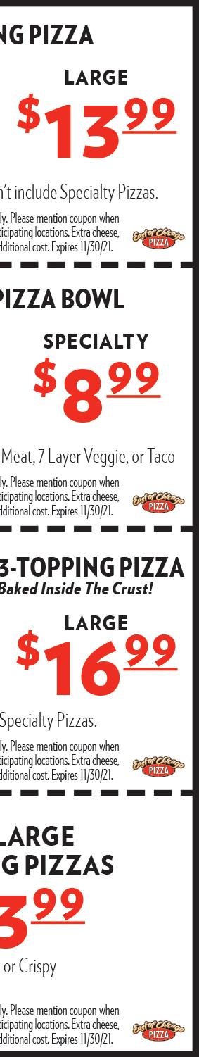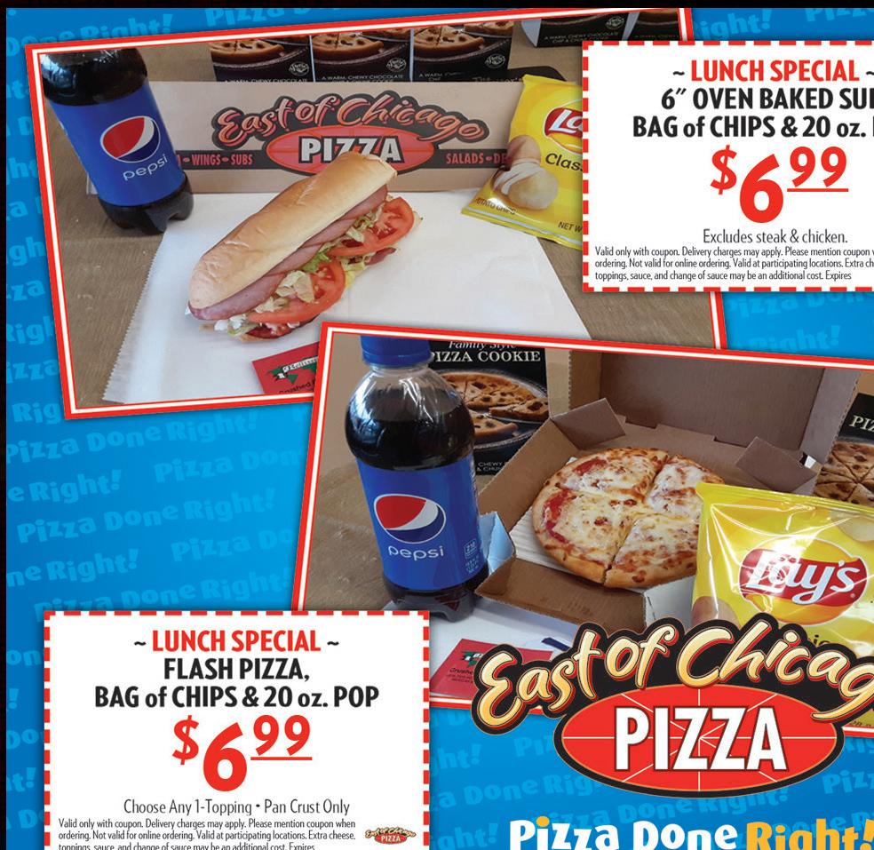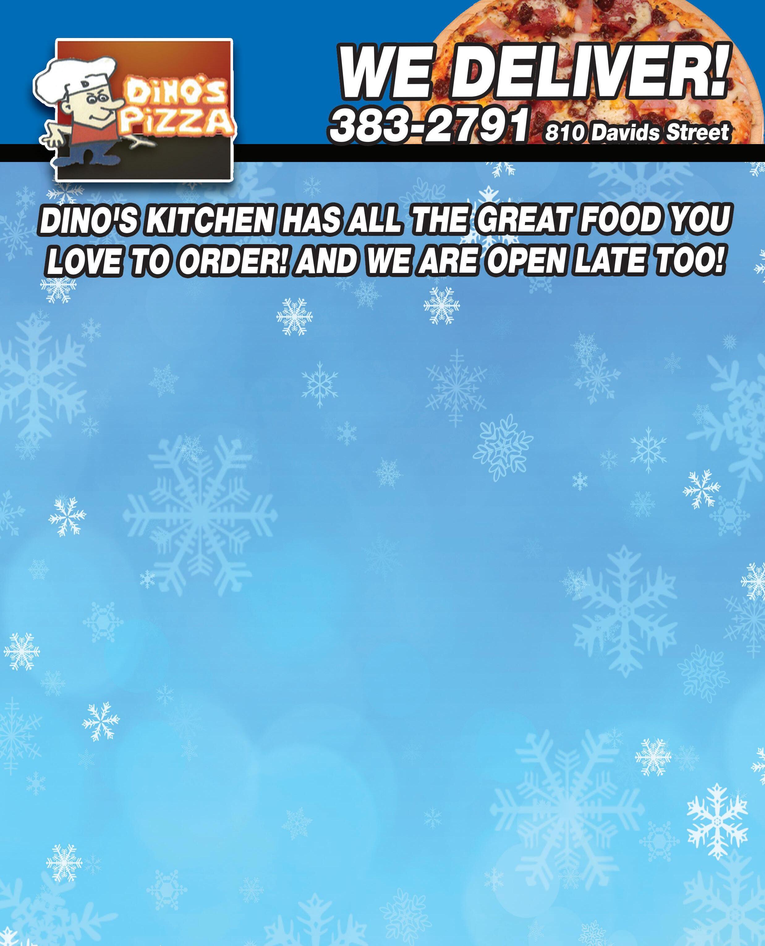 In Town Delivery $5 • Free In Town Delivery on Food Orders Over $35 Delivery Available 4pm-12am Monday - Sunday 2pm - Midnight Dine-In • Carry-Out • Drive-Thru • 810 Davids Street • 740-383-2791 Monday - Sunday 2pm - Midnight 18” 1-Item Pizza Only $999 Must Present Coupon. Expires 2/17/22 60 Pc. Snack Bucket Chicken Fingers, Mushrooms, Onion Rings, Corn Dogs,Pepperoni Sticks, Mozzarella Sticks, Assorted Veggies $2599 or 30 Pc. $1499 Must Present Coupon. Expires 2/17/22 20 Pc. Walleye Bucket With French Fries, Breadsticks and Choice of Cole Slaw, Baked Beans or Macaroni Salad Only $2499 Must Present Coupon. Expires 2/17/22 16” Super Sub Your Choice: Pizza, Italian, Ham, Turkey 1 Only $849 2 Only $1499 Must Present Coupon. Expires 2/17/22 20 Boneless Chicken Wings Your Choice: Regular, BBQ or Hot Only $1299 10 Pc. $6.99 Must Present Coupon. Expires 2/17/22 Pizza Party Pack Giant 18” Pepperoni Pizza, 6 Chicken Wings (Your choice: hot, bbq or original), 6 Breadsticks (Choice of ranch dip or cocktail sauce), 1 lb of Macaroni Salad or Cole Slaw Only $2499 Must Present Coupon. Expires 2/17/22 Lasagna or Spaghetti Dinner With Salad and Garlic Bread Only $699 Must Present Coupon. Expires 2/17/22 Super Special Large Pizza With Your Choice of 3 Toppings (excludes extra cheese) Only $899 Must Present Coupon. Expires 2/17/22 10 Chars or Shredded Chicken or BBQ Pork or Sloppy Joe with Fries Only $2199 Must Present Coupon. Expires 2/17/22 We Accept In Store Only No Checks On Delivery Large Deluxe Salads Your Choice Mix & Match Chef Loaded or Taco Loaded 1 Only $799 2 Only $1399 Must Present Coupon. Expires 2/17/22 EVERYDAY BUY 2 SPECIALS! 2 Large Cheese Pizzas $11.99 2 Large Cheese Pizzas w/1 Item $13.99 2 Large Cheese Pizzas w/2 Item $15.99 2 Large Five Item Deluxe Pizzas $19.99 15 Jumbo Chicken Wings Only $1699 Must Present Coupon. Expires 2/17/22