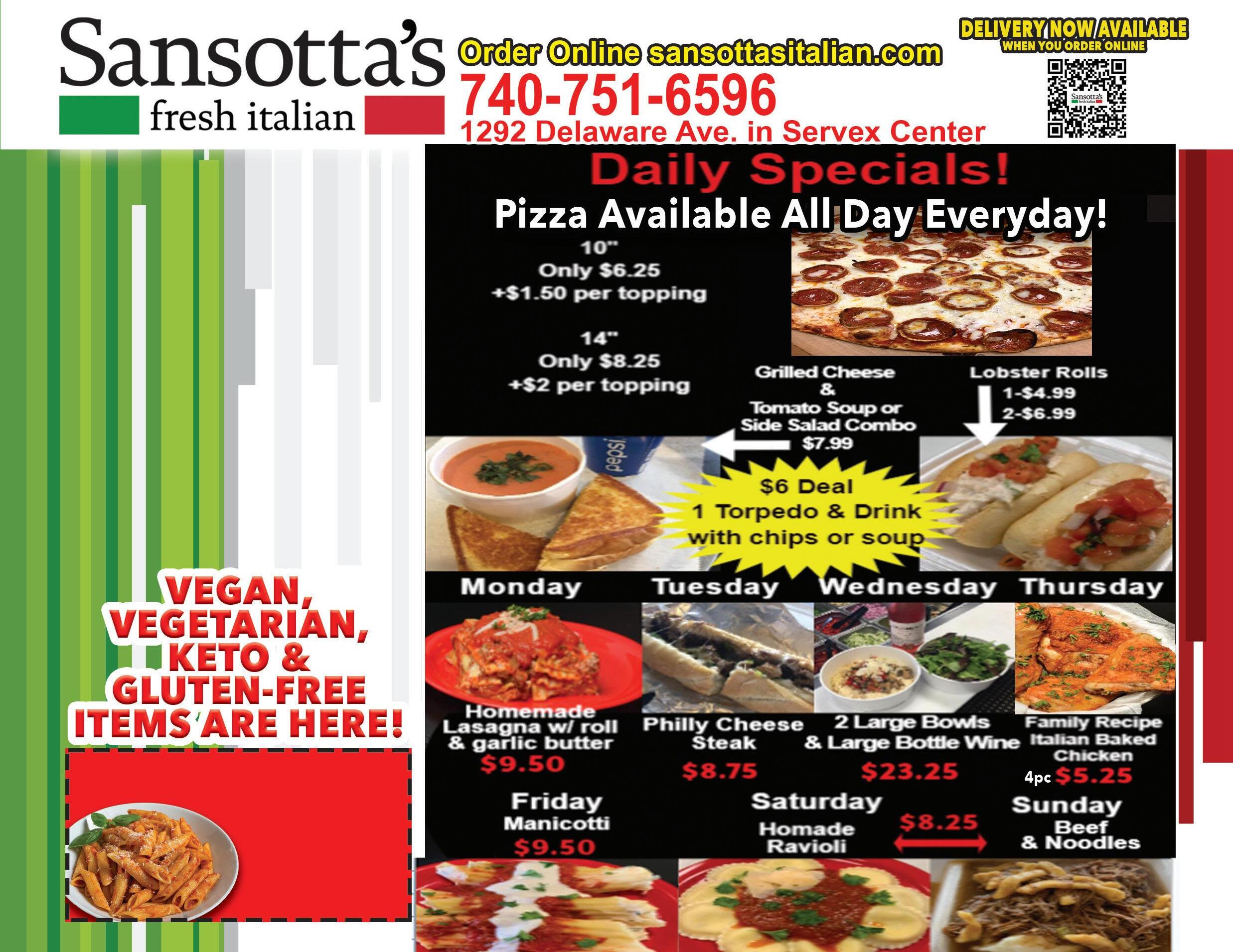 facebook.com/SansottasItalian Sansottasfreshitalian@yahoo.com Catering Always Available NOW AVAILABLE 48oz Cartons of Homemade Ice Cream • Pints of Gelato Ice Cream Sandwiches & Fudge Any Pasta Bowl or Salad Must present coupon. Not valid with other offers. Expires 2/17/22. $1.00 OFF NEW YEAR NEW YOU! Eat Good & Look Good! WIDE SELECTION OF HEALTHY OPTIONS!!!!