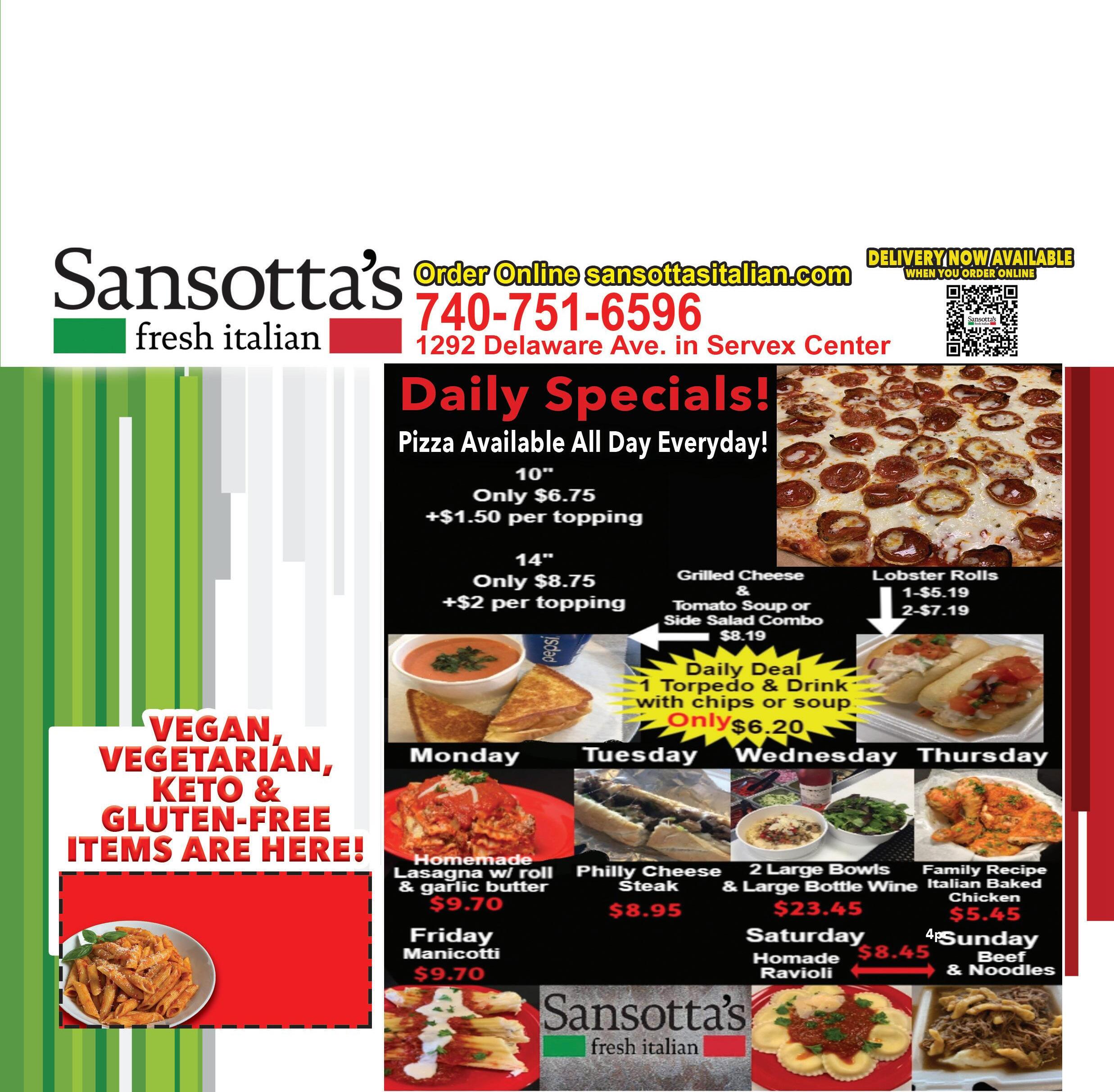 facebook.com/SansottasItalian Sansottasfreshitalian@yahoo.com Catering Always Available NOW AVAILABLE 48oz Cartons of Homemade Ice Cream • Pints of Gelato Ice Cream Sandwiches & Fudge Any Pasta Bowl or Salad Must present coupon. Not valid with other offers. Expires 8/11/22. $1.00 OFF Prices are subject to change at any time FRESH IS BEST! SALADS, PASTA & PIZZA! SALADS, PASTA & PIZZA! Catering For Any Size Group, Perfect For Your Summer Gatherings
