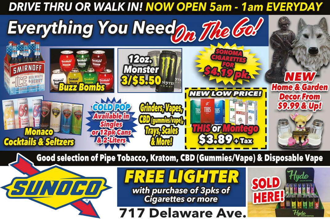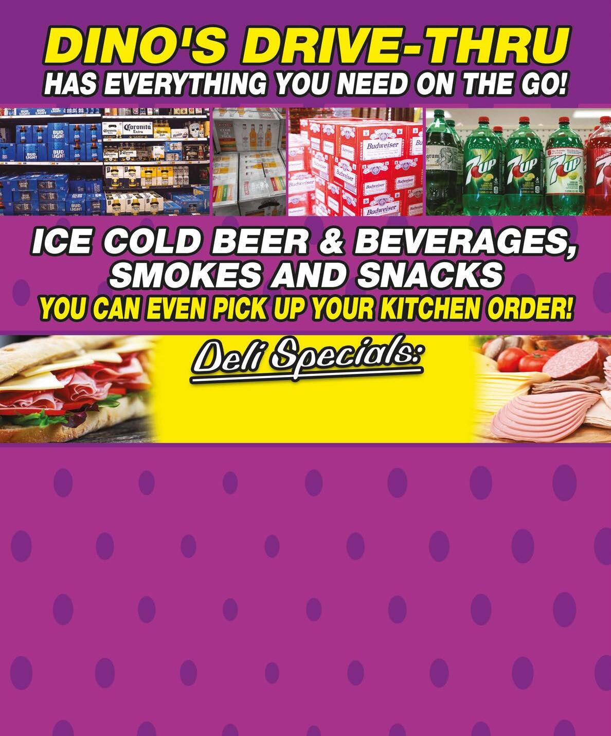 Sunday through Thursday • 8” Italian, Ham or Turkey Sub $5.49 • Large Pepperoni $6.99 • Large 3 Item Pizza $7.99 • 16” Super Sub $7.99 • Large Chef Salad $7.49 Bologna $1.99/lb. Chipped Ham $3.49/lb. Buffet Ham $3.99/lb. Cooked Ham $2.99/lb. Swiss Cheese $4.99/lb. Hot Pepper Cheese $4.99/lb. Tavern Ham $3.99/lb. WEDNESDAYS FROM 2PM - 8PM Includes a Side Salad & 2pc Garlic Bread * Dine in only. Extra salad and garlic breac are available for additional fee Hungry and In a Rush? Check Out These Convenient Drive Thru Pick Up Specials! Everyday Dine In Special: 2 PORK CHOPS SERVED WITH POTATO & COLE SLAW $5.99 TUESDAY PICK UP OR DINE IN SPECIAL: LARGE 1 ITEM PIZZA $5.00