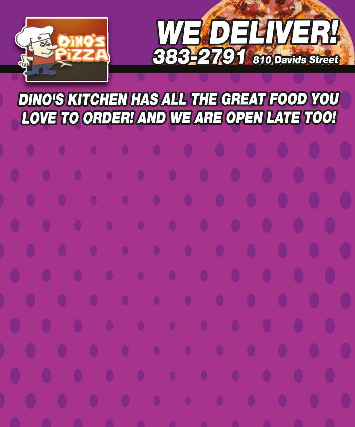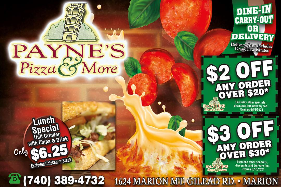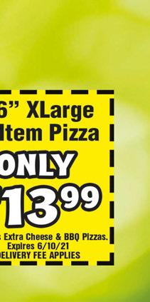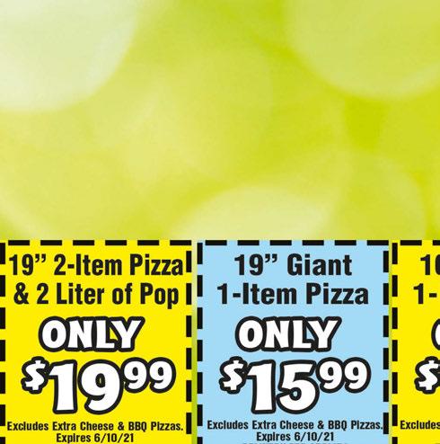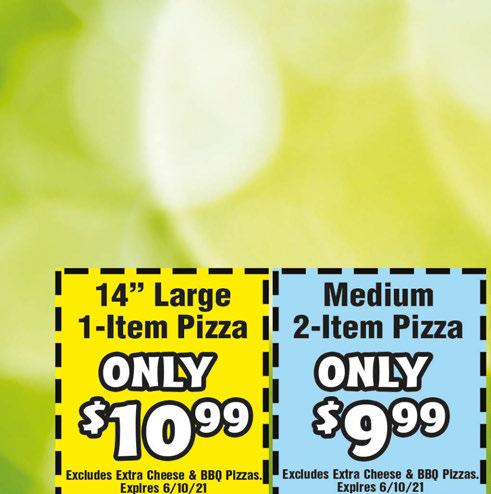 In Town Delivery $4 • Free In Town Delivery on Food Orders Over $30 Delivery Available 4pm-12am Monday - Sunday 2pm - Midnight • EVERYDAY BUY 2 SPECIALS! Dine-In • Carry-Out • Drive-Thru • 810 Davids Street • 740-383-2791 Monday - Sunday 2pm - Midnight 18” 1-Item Pizza Only $999 Must Present Coupon. Expires 6/10/21 60 Pc. Snack Bucket Chicken Fingers, Mushrooms, Onion Rings, Corn Dogs, Pepperoni Sticks, Mozzarella Sticks, Assorted Veggies $2199 or 30 Pc. $1399 Must Present Coupon. Expires 6/10/21 20 Pc. Walleye Bucket With French Fries, Breadsticks and Choice of Cole Slaw, Potato Salad, Baked Beans or Macaroni Salad Only $2499 Must Present Coupon. Expires 6/10/21 16” Super Sub Your Choice: Pizza, Italian, Ham, Turkey 1 Only $849 2 Only $1499 Must Present Coupon. Expires 6/10/21 20 Boneless Chicken Wings Your Choice: Regular, BBQ or Hot Only $1399 10 Pc. $6.99 Must Present Coupon. Expires 6/10/21 Pizza Party Pack Giant 18” Pepperoni Pizza, 6 Chicken Wings (Your choice: hot, bbq or original) 6 Breadsticks (Choice of ranch dip or cocktail sauce) 1 lb of Potato Salad & Dessert Only $2899 Must Present Coupon. Expires 6/10/21 Lasagna or Spaghetti Dinner With Salad and Garlic Bread Only $699 Must Present Coupon. Expires 6/10/21 Super Special Large Pizza With Your Choice of 3 Toppings (excludes extra cheese) Only $799 Must Present Coupon. Expires 6/10/21 Large Deluxe Salads Your Choice Mix & Match Chef Loaded or Taco Loaded 1 Only $799 2 Only $1399 Must Present Coupon. Expires 6/10/21 2 Large Cheese Pizzas $10.99 10 Chars or Shredded Chicken or BBQ Pork or Sloppy Joe with Fries Only $1999 Must Present Coupon. Expires 6/10/21 We Accept In Store Only No Checks On Delivery 2 Large Cheese Pizzas w/1 Item $12.99 2 Large Cheese Pizzas w/2 Item $14.99 2 Large Five Item Deluxe Pizzas $18.99