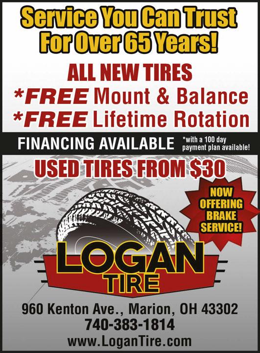 Call or Text JT 740-272-0851 • 1775 Marion Waldo Rd., Marion, OH 43302 (Formerly the Loft) A Private Park & Pavilion benefiting Homeless to Home Animal Rescue & Cat Sanctuary A PERFECT PLACE for a UNIQUE OUTDOOR EVENT. Open air Pavilion, scenic waterfall, firepits, outdoor stage and in a beautiful wooded setting. Perfect for Graduations, Weddings & Receptions, Family Reunions and Special Events. Pricing will depend on month, day, time and how many people. We can accommodate 100+ 541 E. CENTER STREET USED TIRES STARTING AROUND $30! $20 OFF FULL SET OF TIRES With coupon. Expires 6/15/21 SPECIAL DISCOUNTS FOR ALL FIRST RESPONDERS (Police, Fire & EMS) VETERANS / ACTIVE MILITARY Not valid with other offers or insurance. Includes clear lenses and select frames. See store for details. Expires 6/10/21. $50 OFF Frame Not valid with other offers or insurance. Includes clear lenses and select frames. See store for details. Expires 6/10/21. FREE Blue Light Filter