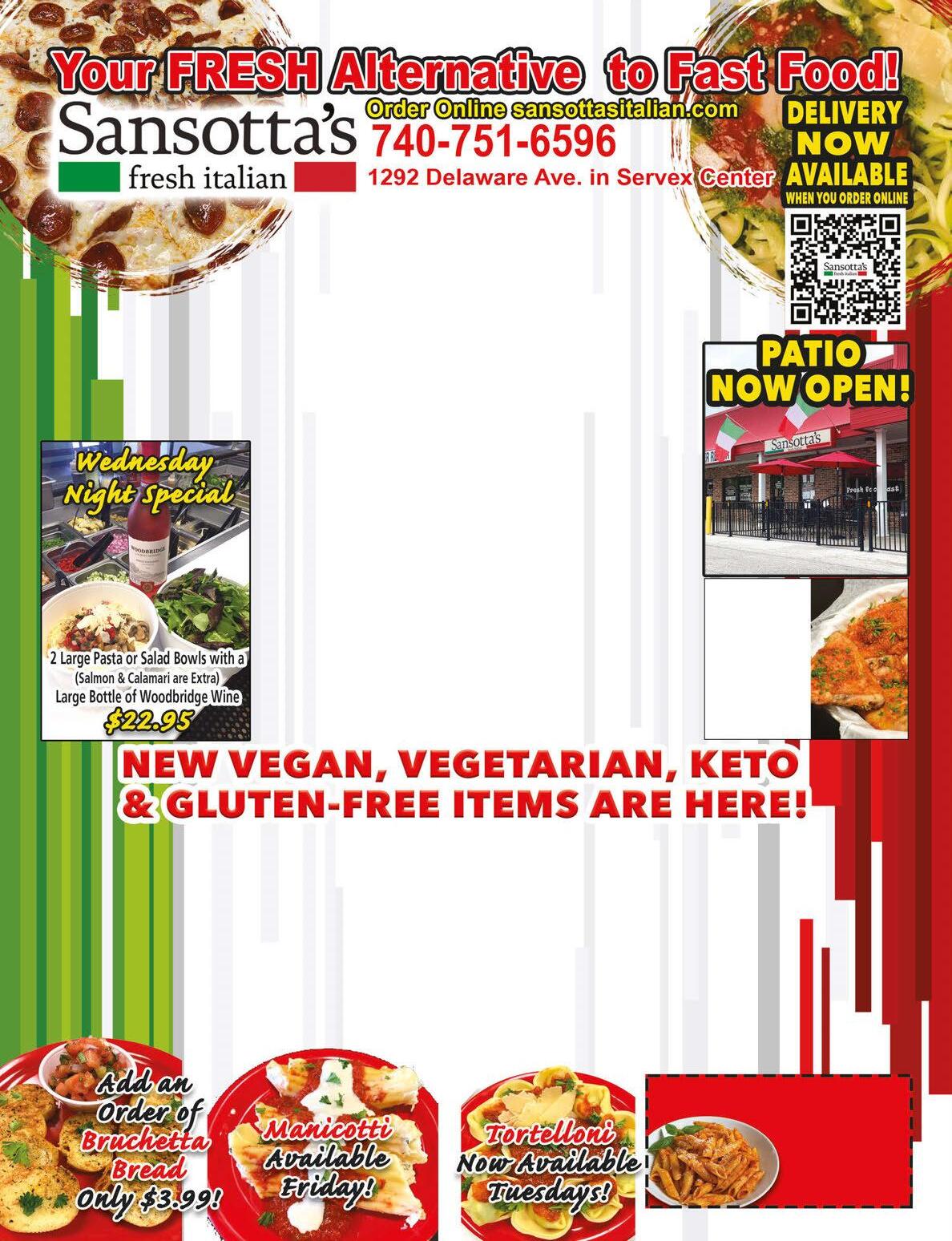 $1.00 OFF Any Pasta Bowl or Salad Must present coupon. Not valid with other offers. Expires 6/15/21. facebook.com/SansottasItalian Sansottasfreshitalian@yahoo.com Catering Always Available Every Thursday is Family Recipe Italian Baked Chicken 4pc only $4.99 (breast, thigh, wing & leg) 10” Vegan Pizza $12.00