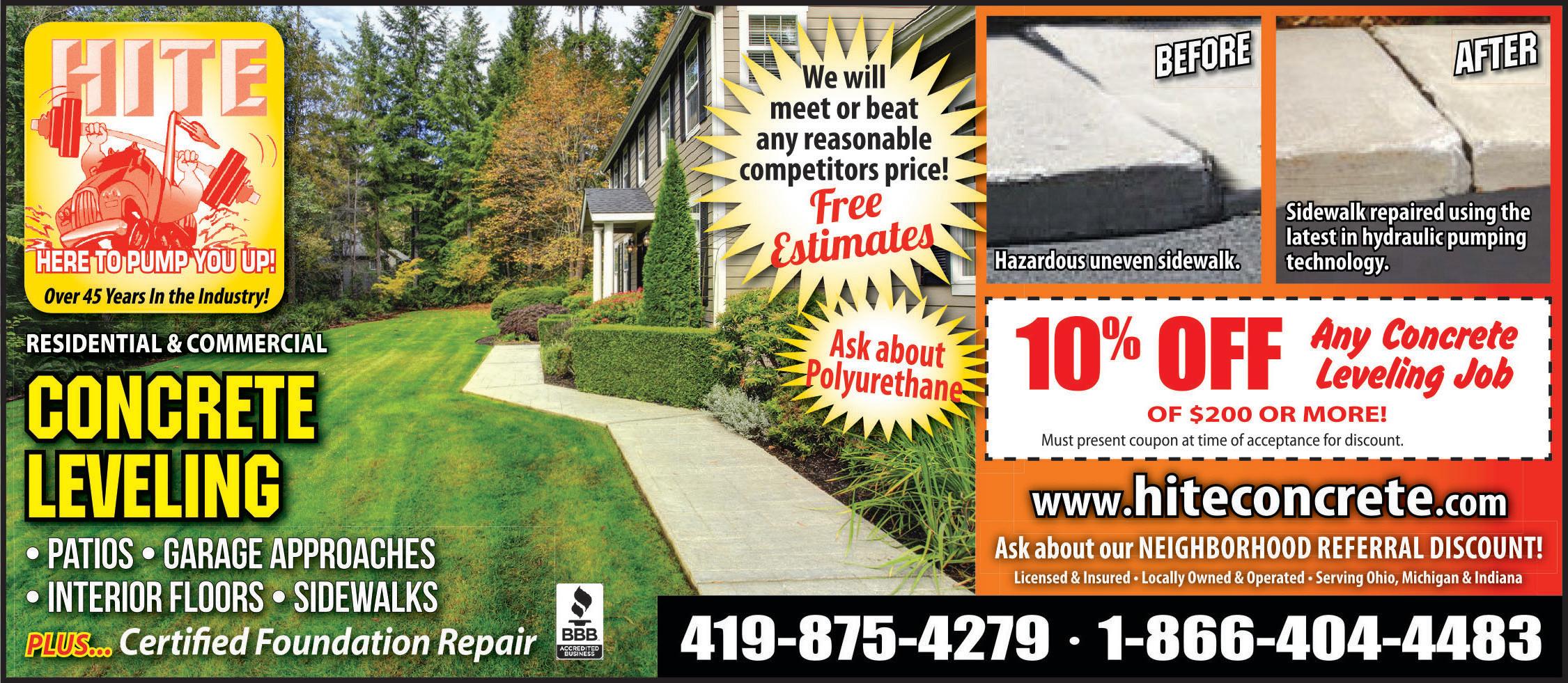 1815 SYLVANIA AVE. • TOLEDO • 419-472-2040 AIR CONDITIONING • Central Air Conditioning • Mini-Split Air Conditioning RETAIL PARTS CENTER Appliance Parts • Air Conditioners • Boilers & Furnaces • Water Heaters FILTERS & HUMIDIFIERS • WATER HEATERS We Service All Brands Of Air Conditioners, Furnaces & Boilers Are you tired of that old furnace breaking down? A new high efficient gas furnace can save up to 40% on your gas bill. Call us today for your FREE ESTIMATE! EATING • Gas Boilers • Gas & Electric Furnaces SAVE $100 Complete Cleaning & Safety Inspection On a New Furnace or A/C SAVE $200 On a New Furnace & A/C $9900 Furnace or A/C up to $30000 UTILITY REBATE One coupon per qualified purchase. Must present coupon at time of estimate. Not valid with any other offer. Exp. 10/31/21 One coupon per qualified purchase. Must present coupon at time of estimate. Not valid with any other offer. Exp. 10/31/21 One coupon per qualified purchase. Must present coupon at time of estimate. Not valid with any other offer. Exp. 10/31/21 WE ALSO DO Power Washing & Sealing www.hiteconcrete.com Ask about our NEIGHBORHOOD referral discount! Licensed & Insured. Locally owned & operated - Serving Ohio, Michigan & Indiana 10% OFF Any CONCRETE LEVELING Job! OF $200 OR MORE! Must present coupon at time of acceptance. Expires 10/31//21 419-875-4279 1-866-404-4483 Find your deal online at Shop locally. Save locally. townmoneysaver.com Savings are just a click away.