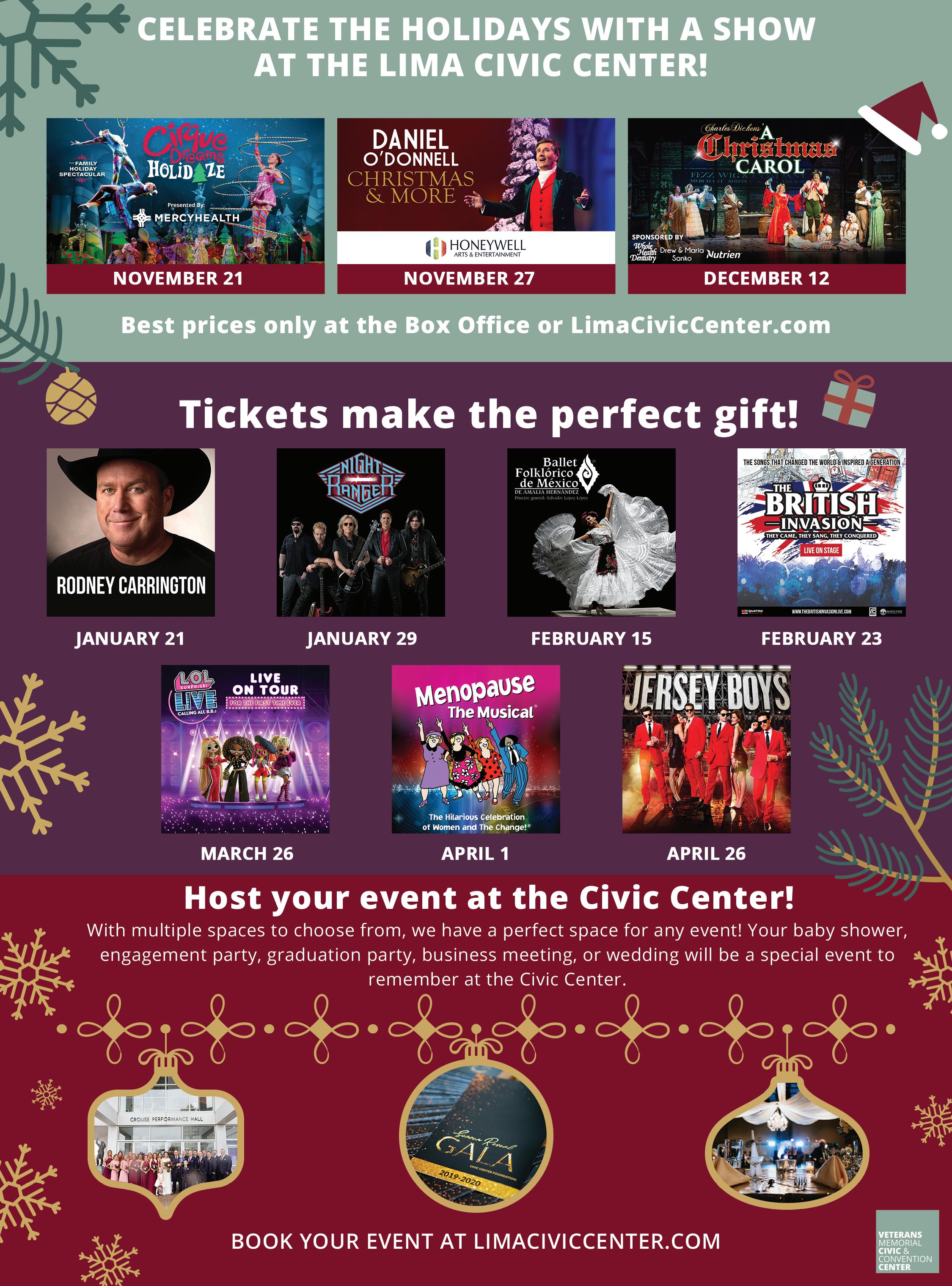 th e a ert BELLEFONTAINE OHIO H D UPCOMING EVENTS THE HOLLAND THEATRE'S Give the Gift of Theater this HOLIDAY SEASON! Buy Now! CALL THE BOX OFFICE AT WWW.THEHOLLANDTHEATRE.ORG WEST CENTRAL OHIO COMMUNITY CONCERT BAND Holland for the Holidays DEC 21 | 7:00PM DEC 17 | 7:30PM Holiday Caravan Tour SQUIRREL NUT ZIPPERS DEC 10 & 11 FROZEN JR. PRESENTED BY Windmill Productions FREE HOLIDAY CONCERT • Convent • FHA: Ex • VA: L oan • Const r uc t • USDA: B • Rehab: A • Ref i nanc Dreaming of homeownership? Contact us today for more info! • Convent i onal: Mor e Ter m Opt i ons w i t h L ess Rest r i c t i ons • FHA: Exper i enc e L ow Dow n Payment w i t h L ow er Cr edi t Sc or e • VA: L oans f or Quali f i ed U.S. Vet er ans and Ac t i ve Mi li t ar y Member s • Const r uc t i on: One- Ti me Close Loan f or New Const r uc t i on • USDA: Bui ld Your Dr eam House w i t h No Money Dow n • Rehab: All- In- One Fi nanc i ng f or Home Renovat i ons • Ref i nanc i ng: Replac e L oan w i t h L ow er Mont hly Payment We make buying a home simple and easy. Dreaming of homeownership? T/F: (937) 637-7191 C: (937) 210-2811 207 S Main St , Bellefontaine, OH 43311 Lisa Ballenger Loan Officer NMLS ID #923585 OH MLO-OH 923585 T/F: (937) 637-7191 C: (937) 210-2811 lballenger@uhm com www uhm com/lballenger Th p d d h f d t p p Wh t t d p g f t d d f p p y d t t q t f serv ces Th s s not an adver semen o oan es mate Cu ren n e es rates oan programs and qua f cat on cr e a can change a any me you have quest ons or need ass s ance we can be eached us ng he con ac n o ma on above 207 S Main St Bellefontaine, OH 43311 Un on Home Mor gage Corp NMLS 2229 nm scons me access o g Lisa Ballenger Loan Officer NMLS ID #923585 OH MLO-OH 923585
