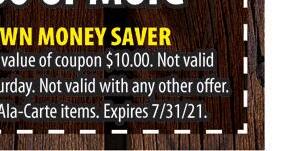 CENTERVILLE Published By Town Money Saver, Inc. Corporate Office • PO Box 356 • Lucas, OH 44843 © 2016 TMS Franchising, Inc. All rights reserved. For advertising information, call Butch 937-286-9976 NEXT ISSUE IN HOMES: July 30, 2021 ADVERTISING DEADLINE: July 16, 2021 POSTAL CUSTOMER PRSRT STD ECRWSS U.S. POSTAGE PAID Town Money Saver, Inc. townmoneysaver.com OFFERS EXPIRE 7/31/21 ( TAKE OUT OR DINE IN ) Order Online www.TokyogrillDayton.com Dine-In, Carry-Out & Delivery with Grubhub, Doordash, Uber Eats. BUFFET NOW OPEN! Scan to Order Online 937-952-5018 Excludes sale items. May not be combined with other offers. Limit one per customer. Valid at Centerville location only. With Town Money Saver Coupon. Expires 7/31/21. Excludes sale items. May not be combined with other offers. Limit one per customer. Valid at Centerville location only. With Town Money Saver Coupon. Expires 7/31/21. $20 OFF Purchase of $100 or More $10 OFF Purchase of $50 or More TRADE IN TO TRADE UP! Bring us your quality used equipment for bigger discounts! www.PlayItAgainSports.com ©2021 Firehouse Subs. Limited time only. Offer valid only at participating locations. Coupon must be presented at time of purchase. Limit one offer per person per visit. Coupon cannot be used in combination with any other offer, coupon, or discount and may not be sold, copied, or altered in any way. Only original coupons will be honored. Void if reproduced, transferred, or assigned. Cash value 1/100¢. Consumer must pay applicable tax, if any. Not your everyday gyro Chicken Gyro Sub ©2021 Firehouse Subs. Limited time only. Offer valid only at participating locations. Coupon must be presented at time of purchase. Limit one offer per person per visit. Coupon cannot be used in combination with any other offer, coupon, or discount and may not be sold, copied, or altered in any way. Only original coupons will be honored. Void if reproduced, transferred, or assigned. Cash value 1/100¢. Consumer must pay applicable tax, if any. FFO MUIDEM ,BUS SPIHC& KNIRD ,notyaD emit .tisivnopuoC rehto,reffo deipoc-la lliw-noh .dengissa elbacilppa ,xat.yna .pxE 1202/13/70 KNIRDPIHCGL/DMFFO3$