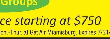 CENTERVILLE July 2021 Shop locally. Shop safely. Support LOCAL businesses! coupon at time of drop off. with any other offers. Expires 6/30/14 Must present TMS coupon at time of drop off. Not valid with any other offers. Expires 6/14/14 Must present TMS coupon at time of drop off. Not valid with any other offers. Expires 6/30/14 OFF Cleaning Leather, Wedding Gowns $195 each SHIRTS Dress shirts laundered & on hangers. 25% OFF Dry Cleaning Excludes Suede, Leather, Wedding Gowns Same Great Service More Offers Available at MMCleaners.com ONLY THE NAME HAS CHANGED Miamisburg-Centerville Rd. Bank & FedEx) 937-433-6693 USE BY JUNE 14! 33 6693 NLY HE NAM T Formerly Concord Custom Cleaners We Clean Uggs! 20% OFF Dry Cleaning Excludes Suede, Leather, Wedding Gowns, Comforters, Households Must present TMS coupon at time of drop off. Not valid with any other offers. Expires 7/31/21 c $2.75 EACH Shirts Dress Shirts Laundered & On Hangers Must present TMS coupon at time of drop off. Not valid with any other offers. Expires 7/31/21 c SOCIAL DISTANCING OBSERVED IN STORE! 1173 Miamisburg-Centerville Rd. (Next to PNC Bank & FedEx) CLEAN & SANITIZE YOUR WINTER CLOTHES & SWEATERS NOW! MON–FRI 8–7 SAT 9–2 937-433-6693 Text Notifications Available When Your Order is Ready Must present TMS coupon at time of drop off. Not valid with any other offers. Expires 7/31/21 c MORE OFFERS AVAILABLE AT MMCLEANERS.COM Happy Independence Day! No Masks! WHOOPIE! FIRST TIME CUSTOMERS! 25% OFF Dry Cleaning Excludes Suede, Leather, Wedding Gowns, Comforters, Households $10 OFF OFFICE VISIT Expires 8/31/2021 Board Certified Physician On-site • Short Wait Time MEDIXUC.COM Mon-Fri: 10am-4pm, Sat & Sun: 10am-2pm NO APPOINTMENT REQUIRED 937-401-2390 4433 Feedwire Rd. Centerville, OH 45440 (In Sugarcreek Crossing across from Costco) Quality, Convenient Healthcare for the Entire Family Adhering to COVID-19 Safety Guidelines Telehealth also available. Call for Telehealth. Complete Urgent Care Services that are Non-life reatening Most Insurances Accepted including: Medicare, Medicaid, Aetna, Anthem, BCBS, CareSource, Tricare, UnitedHealthcare, and More. BOOKING PARTIES FOR 2021 With coupon only. Not valid with any other off er. One coupon per visit. Expires 7/31/21 BOGO Monday–Thursday (no restrictions) Let’s get excited about summer! Hours 12pm-9pm, 7 days a week 9pm - midnight Friday and Saturdays ($20 per person late night unlimited Email us at morefun@youradventuregolf.com 615 Miamisburg-Centerville Rd. Centerville, Oh 45459 | 937-999-4478 With coupon only. Not valid with any other off er. One coupon per visit. Expires 7/31/21 1/2 off Late Night 9pm-Midnight BYOB