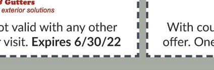 Must mention coupon when scheduling. Not valid with other o ers or discounts. Some restrictions apply. Expires 6/28/22.