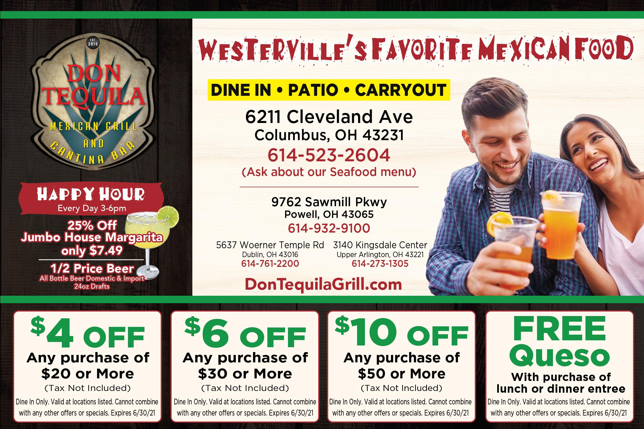 Mexican Restaurant EL RODEO 2808 Stelzer Road • Columbus, OH 43219 • 614-532-7109 Hours: Mon-Thurs 11am-10pm • Fri & Sat 11am-11pm • Sun 11am-9:30pm Children’s Menu Available Guacamole $10 OFF Any $50 Purchase (excludes alcohol) Not valid with other offers. With coupon. Expires 6/24/21. 50% OFF Entrée Buy One Entrée, Get One Entrée of Equal or Lesser Value Half Off (excludes Fajitas and/or Steak Items) Not valid with other offers. With coupon. Expires 6/24/21. $5 OFF Any $25 Purchase (excludes alcohol) Not valid with other offers. With coupon. Expires 6/24/21. HAPPY HOUR Specials 2p-8p M-W & F LUNCH BUFFET *Fresh Tableside Guacamole* ALL WEEK 11am-2pm orderelrodeocolumbus.com We are taking every precaution to make your dining experience safe and enjoyable DINING ROOM & PATIO NOW OPEN!
