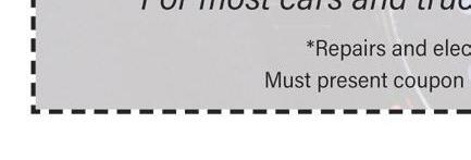 and affiliates. ©2019 The Goodyear Tire & Rubber Company. All rights reserved. on purchases made from October 1 to December 31, 2019. ASSURANCE ® MAXLIFE ™ ULTRA GRIP ICE BONUS OF MORE YOU USE THE GOODYEAR CREDIT CARD Must present coupon to get this offer. Savings off regular price. No other discounts apply. Additional charges for shop supplies may be added. Will be deducted from Gallagher Tire and Automotive price at the time of purchase. Redeem at Gallagher Tire and Automotive. Offer ends 8/31/21 TMS SLIDING SCALE SAVINGS December 31, 2019. ASSURANCE ® ALL-SEASON CENTER SAVINGS SAVE! SCALE” COUPON $20 OFF $30 OFF $40 OFF $50 OFF Card. Subject to cre with purchase or $100 Prepaid Card with purchase on the Goodyear Credit Card of: Sport All-Season excluding ROF + SCT, Ultra Grip Ice, Ultra Grip Ice WRT, Ultra Grip Mastercard International Incorporated. This Prepaid Card may be used everywhere and expire after 6 mon these rebates. terms, conditions, and fees apply. See participating retailer for complete details and reserved. 31, 2019. ASSURANCE MAXLIF GALLAGHER TIRE & AUTOMOTIVE SERVICE CENTER 3050 WOODMAN DR. • KETTERING, OH 45420 • 937-298-7269 YOUR TOTAL CAR CARE CENTER FLUID CHANGE SPECIAL BRAKE SPECIAL SLIDING SCALE SAVINGS $ 50 OFF SAVE! ANY FLUID CHANGE Antifreeze, Brake, Power Steering, Transmission ANY BRAKE SERVICE OF $100 OR MORE Come see us if your: Brake-warning light is on, you hear grinding or squealing, you notice a change in braking pressure. OIL CHANGE SPECIAL $ 22 95 Conventional Valvoline Oil Change or $15 OFF Synthetic Oil Change. Includes Free 4 Tire Rotation & Brake Inspection Regular Price ($25 per Axle) THE “SLDING SCALE” SERVICE COUPON UP TO $100-$199.99 $20 OFF $200-$299.99 $30 OFF $300-$499.99 $40 OFF $500 or MORE $50 OFF $ 15 OFF AIR CONDITIONING $ 15 OFF REGULAR PRICE AIR CONDITIONING SERVICE. REFRIGERANT ADDITIONAL *Get up to $75 back by online or mail-in rebate on a qualifying purchase of a set of 4 select Goodyear tires with any form of payment method; plus get an added rebate of up to $75 more when the purchase is made on the Goodyear Credit Card. Subject to credit approval. Get a $75 Prepaid Card with purchase or $150 Prepaid Card with purchase on the Goodyear Credit Card of: Assurance WeatherReady, Eagle Exhilarate, Eagle F1 Asymmetric All-Season excluding ROF + SCT, and Wrangler All-Terrain Adventure with Kevlar. Get a $50 Prepaid Card with purchase or $100 Prepaid Card with purchase on the Goodyear Credit Card of: Assurance ComforTred Touring, Wrangler DuraTrac, and Wrangler Fortitude HT. Get a $25 Prepaid Card with purchase or $50 Prepaid Card with purchase on the Goodyear Credit Card of: Assurance All-Season, Assurance MaxLife, Eagle Sport All-Season excluding ROF + SCT, Ultra Grip Ice, Ultra Grip Ice WRT, Ultra Grip Ice WRT LT, WinterCommand, and WinterCommand LT. . This Prepaid Card is issued by Sunrise Banks N.A., Member FDIC, pursuant to a license from Mastercard International Incorporated. Mastercard is a registered trademark of Mastercard International Incorporated. This Prepaid Card may be used everywhere Mastercard debit cards are accepted. Registration, activation, acceptance, or use of this Prepaid Card constitutes acceptance of the terms and conditions stated in the Prepaid Card Agreement. Prepaid Cards will not have cash access and expire after 6 months, and other terms, conditions, and fees may apply. Offers available only at participating U.S. Goodyear retailers and websites. Offers valid only for U.S. residents who are individual consumers with mailing addresses in the U.S. and U.S. territories. Commercial fleets are not eligible for these rebates. Not valid on previous purchases. Cannot be combined with other Goodyear rebate offers. Rebate forms must be postmarked no later than 1/31/20. Base portion of rebate offered by Goodyear, and bonus portion of rebate offered by Citibank, N.A. Goodyear is not affiliated with Mastercard. Additional terms, conditions, and fees apply. See participating retailer for complete details and are trademarks or registered trademarks of E.I. du Pont de Nemours and Company used under license by The Goodyear Tire & Rubber Company and affiliates. ©2019 The Goodyear Tire & Rubber Company. All rights reserved. EAGLE EXHILARATE™ ASSURANCE® WEATHERREADY ® By online or mail-in rebate. Rebates paid by Goodyear Prepaid Mastercard® on purchases made from October 1 to December 31, 2019. WITH OUR BEST DEALS OF THE SEASON WRANGLER ® ALL-TERRAIN ADVENTURE W/KEVLAR UPGRADE ANDSAVE OCTOBER ASSURANCE ® MAXLIFE ASSURANCE ® ALL-SEASON WINTERCOMMAND ULTRA GRIP ® ICE GET $75 BACK ON A SET OF 4 SELECT GOODYEAR® TIRES AN ADDED BONUS OF $75 MORE WHEN YOU USE THE GOODYEAR CREDIT CARD FORTITUDEWRANGLER®HT WRANGLER DURATRAC® ASSURANCE ® COMFORTRED® TOURING GET $50 BACK* ON A SET OF 4 SELECT GOODYEAR TIRES AN ADDED BONUS OF $50 MORE WHEN YOU USE THE GOODYEAR CREDIT CARD GET $25 BACK* ON A SET OF 4 SELECT GOODYEAR TIRES AN ADDED BONUS OF $25 MORE WHEN YOU USE THE GOODYEAR CREDIT CARD