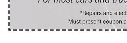 YOUR TOTAL CAR CARE CENTER Must present coupon to get this offer. Savings off regular price. No other discounts apply. Additional charges for shop supplies may be added. Will be deducted from Gallagher Tire and Automotive price at the time of purchase. Redeem at Gallagher Tire and Automotive. Offer ends 10/31/19 $500 or MORE $50 OFF Must present coupon to get this offer. Savings off regular price. No other discounts apply. Additional charges for shop supplies may be added. Will be deducted from Gallagher Tire and Automotive price at the time of purchase. Redeem at Gallagher Tire and Automotive. Offer ends 10/31/19 $ 15 REGULAR AIR CONDITIONING SERVICE. REFRIGERANT ADDITIONAL *Get up to $75 back by online or mail-in rebate on a qualifying purchase of a set of 4 select Goodyear tires with any form of payment method; plus get an added rebate of up to $75 more when the purchase is made on the Goodyear Credit Card. Subject to credit approval. Get a $75 Prepaid Card with purchase on the Goodyear Credit Card of: Assurance WeatherReady, Eagle Exhilarate, Eagle F1 Asymmetric All-Season excluding ROF + SCT, and Wrangler All-Terrain Adventure with Kevlar. Get a $50 Prepaid Card with purchase or $100 Prepaid Card with purchase Assurance ComforTred Touring, Wrangler DuraTrac, and Wrangler Fortitude HT. Get a $25 Prepaid Card with purchase or $50 Prepaid Card with purchase on the Goodyear Credit Card of: Assurance All-Season, Assurance MaxLife, Eagle Sport All-Season excluding ROF + SCT, Ultra Grip . This Prepaid Card is issued by Sunrise Banks N.A., Member FDIC, pursuant to a license from Mastercard International Incorporated. Mastercard is a registered trademark of Mastercard International Incorporated. This Prepaid Mastercard debit cards are accepted. Registration, activation, acceptance, or use of this Prepaid Card constitutes acceptance of the terms and conditions stated in the Prepaid Card Agreement. Prepaid Cards will not have cash access and expire after 6 months, and other terms, conditions, Offers available only at participating U.S. Goodyear retailers and websites. Offers valid only for U.S. residents who are individual consumers with mailing addresses in the U.S. and U.S. territories. Commercial fleets are not eligible for these rebates. Not valid on previous purchases. Goodyear rebate offers. Rebate forms must be postmarked no later than 1/31/20. Base portion of rebate offered by Goodyear, and bonus portion of rebate offered by Citibank, N.A. Goodyear is not affiliated with Mastercard. Additional terms, conditions, and fees apply. See participating are trademarks or registered trademarks of E.I. du Pont de Nemours and Company used under license by The Goodyear Tire & Rubber Company and affiliates. ©2019 The Goodyear Tire & Rubber Company. All rights reserved. OFFERS AVAILABLE AT THE FOLLOWING LOCATIONS: By online or mail-in rebate. Rebates paid by Goodyear Prepaid Mastercard® on purchases made from October 1 to December 31, 2019. YOUR TOTAL CAR CARE CENTER BRAKE SPECIAL SLIDING SCALE SAVINGS 50 OFF SAVE! ANY BRAKE SERVICE OF $100 OR MORE Come see us if your: Brake-warning light is on, you hear grinding or squealing, you notice a change in braking pressure. Regular Price ($25 per Axle) THE “SLDING SCALE” SERVICE COUPON $100-$199.99 $20 OFF $200-$299.99 $30 OFF $300-$499.99 $40 OFF $500 or MORE $50 OFF AIR CONDITIONING $ 15 OFF REGULAR PRICE AIR CONDITIONING SERVICE. REFRIGERANT ADDITIONAL By online or mail-in rebate. Rebates paid by Goodyear Prepaid Mastercard® on purchases made from October 1 to December 31, 2019. ASSURANCE ® MAXLIFE ASSURANCE ® ALL-SEASON WINTERCOMMAND ULTRA GRIP ICE GET $25 BACK ON A SET OF 4 SELECT GOODYEAR TIRES AN ADDED BONUS OF $25 MORE* WHEN YOU USE THE GOODYEAR CREDIT CARD OFFERS AVAILABLE AT THE FOLLOWING LOCATIONS: By online or mail-in rebate. Rebates paid by Goodyear Prepaid Mastercard on purchases made from October 1 to December 31, 2019. YOUR TOTAL CAR CARE CENTER BRAKE SPECIAL SLIDING SCALE SAVINGS $ 50 OFF SAVE! ANY BRAKE SERVICE OF $100 OR MORE Come see us if your: Brake-warning light is on, you hear grinding or squealing, you notice a change in braking pressure. Regular Price ($25 per Axle) THE “SLDING SCALE” SERVICE COUPON UP TO $100-$199.99 $20 OFF $200-$299.99 $30 OFF $300-$499.99 $40 OFF $500 or MORE $50 OFF AIR AIR By online or mail-in rebate. Rebates paid by Goodyear Prepaid Mastercard® on purchases made from October 1 to December 31, 2019. ASSURANCE ® MAXLIFE ASSURANCE ® ALL-SEASON ULTRA GET $25 BACK* ON A SET OF 4 SELECT GOODYEAR TIRES AN ADDED BONUS OF $25 MORE* WHEN YOU USE THE GOODYEAR CREDIT CARD OFFERS AVAILABLE AT THE FOLLOWING LOCATIONS: By online or mail-in rebate. Rebates paid by Goodyear Prepaid Mastercard on purchases made from October 1 to December 31, 2019. WITH OUR BEST DEALS OF THE SEASON UPGRADE ANDSAVE OCTOBER 1 - DECEMBER GET 75 BACK ON A SET OF 4 SELECT GOODYEAR AN ADDED BONUS OF 75 MORE WHEN YOU USE THE GOODYEAR CREDIT CARD BACK ON A SET OF 4 SELECT GOODYEAR TIRES ADDED BONUS OF 25 GOODYEAR TIRES AN ADDED BONUS OF MORE* WHEN YOU USE THE GOODYEAR CREDIT CARD CHANGE SPECIAL BRAKE SPECIAL SLIDING SCALE SAVINGS 50 OFF SAVE! ANY FLUID CHANGE Antifreeze, Brake, Power Steering, Transmission ANY BRAKE SERVICE OF $100 OR MORE Come see us if your: Brake-warning light is on, you hear grinding or squealing, you notice a change in braking pressure. Regular Price ($25 per Axle) THE “SLDING SCALE” SERVICE COUPON $100-$199.99 $20 OFF $200-$299.99 $30 OFF $300-$499.99 $40 OFF $500 or MORE $50 OFF 15 AIR $ REGULAR AIR REFRIGERANT By online or mail-in rebate. Rebates paid by Goodyear Prepaid Mastercard® on purchases made from October 1 to December 31, 2019. WITH OUR BEST DEALS OF THE SEASON ALL-TERRAIN KEVLAR ® UPGRADE OCTOBER 1 - DECEMBER 31 ASSURANCE ® MAXLIFE ™ ASSURANCE ® ALL-SEASON ULTRA GRIP ICE GET 50 ADDED BONUS OF 50 $25 BACK ON A SET OF 4 SELECT GOODYEAR TIRES AN ADDED BONUS OF $25 MORE* WHEN YOU USE THE GOODYE