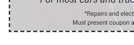 YOUR TOTAL CAR CARE CENTER Must present coupon to get this offer. Savings off regular price. No other discounts apply. Additional charges for shop supplies may be added. Will be deducted from Gallagher Tire and Automotive price at the time of purchase. Redeem at Gallagher Tire and Automotive. Offer ends 10/31/19 $500 or MORE $50 OFF Must present coupon to get this offer. Savings off regular price. No other discounts apply. Additional charges for shop supplies may be added. Will be deducted from Gallagher Tire and Automotive price at the time of purchase. Redeem at Gallagher Tire and Automotive. Offer ends 10/31/19 $ 15 REGULAR AIR CONDITIONING SERVICE. REFRIGERANT ADDITIONAL *Get up to $75 back by online or mail-in rebate on a qualifying purchase of a set of 4 select Goodyear tires with any form of payment method; plus get an added rebate of up to $75 more when the purchase is made on the Goodyear Credit Card. Subject to credit approval. Get a $75 Prepaid Card with purchase on the Goodyear Credit Card of: Assurance WeatherReady, Eagle Exhilarate, Eagle F1 Asymmetric All-Season excluding ROF + SCT, and Wrangler All-Terrain Adventure with Kevlar. Get a $50 Prepaid Card with purchase or $100 Prepaid Card with purchase Assurance ComforTred Touring, Wrangler DuraTrac, and Wrangler Fortitude HT. Get a $25 Prepaid Card with purchase or $50 Prepaid Card with purchase on the Goodyear Credit Card of: Assurance All-Season, Assurance MaxLife, Eagle Sport All-Season excluding ROF + SCT, Ultra Grip . This Prepaid Card is issued by Sunrise Banks N.A., Member FDIC, pursuant to a license from Mastercard International Incorporated. Mastercard is a registered trademark of Mastercard International Incorporated. This Prepaid Mastercard debit cards are accepted. Registration, activation, acceptance, or use of this Prepaid Card constitutes acceptance of the terms and conditions stated in the Prepaid Card Agreement. Prepaid Cards will not have cash access and expire after 6 months, and other terms, conditions, Offers available only at participating U.S. Goodyear retailers and websites. Offers valid only for U.S. residents who are individual consumers with mailing addresses in the U.S. and U.S. territories. Commercial fleets are not eligible for these rebates. Not valid on previous purchases. Goodyear rebate offers. Rebate forms must be postmarked no later than 1/31/20. Base portion of rebate offered by Goodyear, and bonus portion of rebate offered by Citibank, N.A. Goodyear is not affiliated with Mastercard. Additional terms, conditions, and fees apply. See participating are trademarks or registered trademarks of E.I. du Pont de Nemours and Company used under license by The Goodyear Tire & Rubber Company and affiliates. ©2019 The Goodyear Tire & Rubber Company. All rights reserved. OFFERS AVAILABLE AT THE FOLLOWING LOCATIONS: By online or mail-in rebate. Rebates paid by Goodyear Prepaid Mastercard® on purchases made from October 1 to December 31, 2019. YOUR TOTAL CAR CARE CENTER BRAKE SPECIAL SLIDING SCALE SAVINGS 50 OFF SAVE! ANY BRAKE SERVICE OF $100 OR MORE Come see us if your: Brake-warning light is on, you hear grinding or squealing, you notice a change in braking pressure. Regular Price ($25 per Axle) THE “SLDING SCALE” SERVICE COUPON $100-$199.99 $20 OFF $200-$299.99 $30 OFF $300-$499.99 $40 OFF $500 or MORE $50 OFF AIR CONDITIONING $ 15 OFF REGULAR PRICE AIR CONDITIONING SERVICE. REFRIGERANT ADDITIONAL *Get up to $75 back by online or mail-in rebate on a qualifying purchase of a set of 4 select Goodyear tires with any form of payment method; plus get an added rebate of up to $75 more when the purchase is made on the Goodyear Credit Card. Subject to credit approval. Get a $75 Prepaid Card with purchase or $150 Prepaid Card with purchase on the Goodyear Credit Card of: Assurance WeatherReady, Eagle Exhilarate, Eagle F1 Asymmetric All-Season excluding ROF + SCT, and Wrangler All-Terrain Adventure with Kevlar. Get a $50 Prepaid Card with purchase or $100 Prepaid Card with purchase on the Goodyear Credit Card of: Assurance ComforTred Touring, Wrangler DuraTrac, and Wrangler Fortitude HT. Get a $25 Prepaid Card with purchase or $50 Prepaid Card with purchase on the Goodyear Credit Card of: Assurance All-Season, Assurance MaxLife, Eagle Sport All-Season excluding ROF + SCT, Ultra Grip Ice, Ultra Grip Ice WRT, Ultra Grip Ice WRT LT, WinterCommand, and WinterCommand LT. This Prepaid Card is issued by Sunrise Banks N.A., Member FDIC, pursuant to a license from Mastercard International Incorporated. Mastercard is a registered trademark of Mastercard International Incorporated. This Prepaid Card may be used everywhere Mastercard debit cards are accepted. Registration, activation, acceptance, or use of this Prepaid Card constitutes acceptance o the terms and conditions stated in the Prepaid Card Agreement. Prepaid Cards will not have cash access and expire after 6 mon Offers available only at participating U.S. Goodyear retailers and websites. Offers valid only for U.S. residents who are individual consumers with mailing addresses in the U.S. and U.S. territories. Commercial fleets are not eligible for these rebates. Not valid on previous purchases. Cannot be combined with other Goodyear rebate offers. Rebate forms must be postmarked no later than 1/31/20. Base portion of rebate offered by Goodyear, and bonus portion of rebate offered by Citibank, N.A. Goodyear is not affiliated with Mastercard. Additional terms, conditions, and fees apply. See participating retailer for complete details and rebate forms. Goodyear Credit Card is issued by Citibank, N.A. are trademarks or registered trademarks of E.I. du Pont de Nemours and Company used under license by The Goodyear Tire & Rubber Company and affiliates. ©2019 The Goodyear Tire & Rubber Company. All rights reserved. By online or mail-in rebate. Rebates paid by Goodyear Prepaid Mastercard® on purchases made from October 1 to December 31, 2019. ASSURANCE ® MAXL
