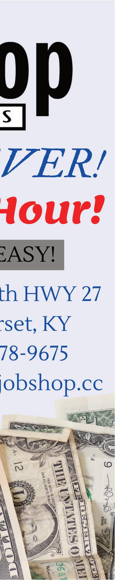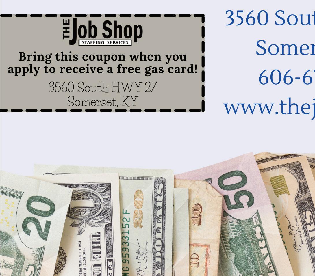 Whittaker Enterprises, LLC GENERAL CONTRACTOR Residential • Commercial • Licensed • Insured 606-875-4683 We do it all: Demolition, Excavation, Tree Service, Landscaping, Construction, Remodeling, Property Management & more! CALL OR TEXT FOR A FREE QUOTE DUSTIN BRUMLEY (606) 492-9261 EXPERTS IN TREE REMOVAL STUMP REMOVAL LAND CLEARING 900 E. Mount Vernon, Somerset, KY • 606-679-9227 4 DRIVE THRU WINDOWS FOR YOUR CONVENIENCE! Hours: Mon.-Fri. 9-6, Sat. 9-1 • somerset.medicineshoppe.com Valid for in-store use only at the participating Medicine Shoppe® Pharmacy listed above. Not valid with any other offers such as $4 prescription plans. Not valid with OTC products or prescriptions covered by any state or federally prescription plans. Limit one per customer. State and local restrictions apply. No cash value. With a New or Transferred Prescription. (Cash purchase: $5.00 off prescription price. Prescription Card: $5.00 worth of Medicine Shoppe® Brand Products - nonprescription) www.medicineshoppe.com/0534 SUPER COUPON Please present coupon at time you place your prescription order. 606-679-9227 $500 Value 100% pure pharmacy™ Hemp-Infused Skincare for All-Day Hydration Hemp: Skincare’s New Super Plant HYDRATING GLOW SERUM ADVANCED SPOT SERUM BITE BALM ROLL-ON Cleansing Tea Tree Oil Let’s work together to protect our community and stop the flu. GET YOUR FLU SHOT TODAY! I GET A FLU SHOT TO PROTECT: We all know someone who has a higher risk of developing serious flu-related complications. The best way to protect them is by getting vaccinated to limit community spread of influenza. children schools co-workers community pregnant womengrandparentsimmuno-compromisedhealthcare system neighbors Specializing in the design and installation of custom closets. Create efficient organization with a closet designed just for you! CLOSETS by Mitzi 606-802-2002 On-demand food delivery from your favorite restaurants. Alcohol & tobacco delivery also available. Place orders online at www.SomersetDelivery.com or by calling 606-727-5171 Use promo code TMS10 for 15% OFF your order
