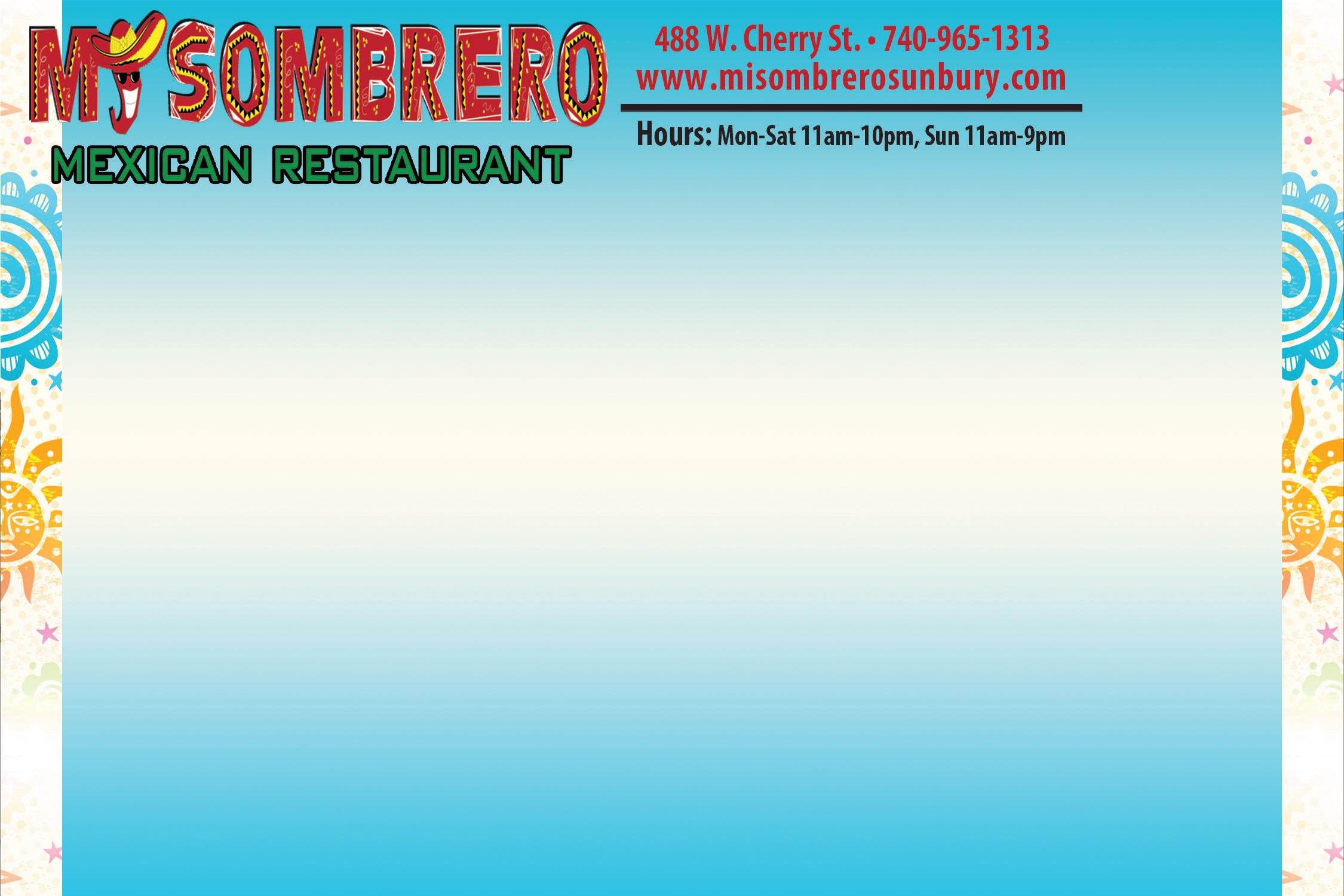 ONLINE ORDERING NOW AVAILABLE! www.misombrerosunbury.com Must present coupon. Not valid with family taco meal or any other discount or offer. Excludes alcohol. Expires 6/30/22. $5 OFF Any Purchase of $30 or More (Sun-Thurs) FATH ER’S DAY SPECIAL $25.99 INCLUDES: 1 Double Chicken or Steak Fajita 2 Serving of Rice & 2 Serving of Beans Must present coupon. Not valid with any other discount or special. VALID JUNE 19TH Only! KIDS EAT FREE EVERY WEDNESDAY (1 child per adult dinner entree purchase. 7yrs old and under.) THURSDAY MARGARITA’S! 50% OFF (Dine-In Only) Includes: 12 Tacos , Soft or Hard, Chicken or Beef, Rice & Beans, Large Bag of Chips & 16oz.Salsa (Available for Take-Out Only) TACO TUESDAYS 1.25¢ Tacos All Day (beef or chicken) FAMILY TACO MEAL $20.99 SPECIAL (May 5th Only) Draft Beer 16oz Imports - $3.25 Domestics - $2.25 GRADUATION PARTY SPECIAL 10% OFF CATERING Lunch Buffet 11am-2:30pm