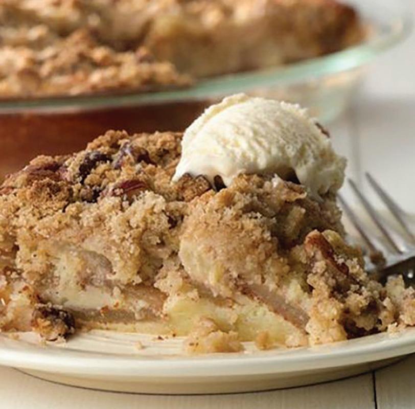 Heat oven 325o. Grease pie pan. Mix apples & spices, turn into plate. Beat remaining ingredients (except streusel) until smooth. Pour over apples. Sprinkle with streusel. Bake until knife inserted comes out clean. 55-60 min.