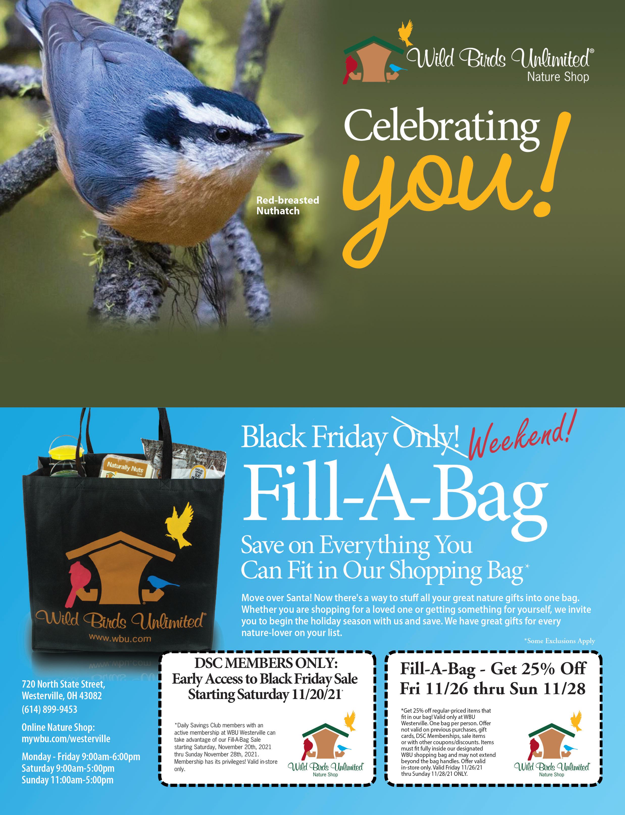 Offer not valid on previous purchases, optics, gift cards, DSC memberships, sale items or other WBU offers. Offer valid in-store only at the Westerville Wild Birds Unlimited Store - NOW thru November 15, 2021
