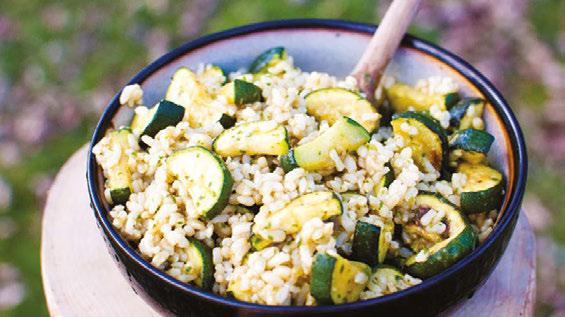 Steam zucchini, slice into ¼” pieces. Reserve a few slices for garnish. Thinly slice green onion. Mix zucchini & green onions together with the rice and dressing.