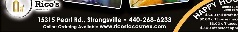 STRONGSVILLE June 2024 Shop locally. Save locally. Scan our QR code to fi nd your perfect invitation! Expires 5/12/24. Offer valid at above location(s) only. One coupon per person per visit per day. Not to be combined with other offers. No cash value. Coupon redeemable in person only. Offers with promo codes may also be redeemed in our app. 13117 OFFER VALID ONLY AT STRONGSVILLE, MACEDONIA & MEDINA, OH LOCATIONS 8210 Macedonia Commons Blvd Macedonia, OH 330-468-1956 13309 Pearl Rd Strongsville, OH 440-783-1912 1176 North Court St Medina, OH 330-952-2292 PROMO CODE OHVR117 Join Our Team - We’re hiring! THE BEST TEAM ON THE PLANET, always *of equal or lesser value. BUY A REGULAR SUB, GET 2nd REGULAR FOR $3.99 Expires 7/11/24. 14312 Pearl Road Strongsville (Across from Hobby Lobby) 440-572-0233 Hrs: Mon & Tue 8-5 • Thur & Fri 8-5 • Sat 8-4 Closed Sunday & Wednesday ALL DRY CLEANING DONE ON PREMISES $500 OFF Your Next Dry Cleaning Order of $25 or More (Excludes Shirts) Not Valid with Any Other Offer. Must Present Coupon at time of order. Expires 7-11-24 Any Size Comforter $2999 (Down Extra) Not Valid with Any Other Offer. Must Present Coupon at time of order. Expires 7-11-24 20% OFF Winter Coats Not Valid with Any Other Offer. Must Present Coupon at time of order. Expires 7-11-24 2 Piece Suits $200 OFF Not Valid with Any Other Offer. Must Present Coupon at time of order. Expires 7-11-24 Pre Paid 20918 Drake Rd., Strongsville, OH 44249 Call to order 440.656.2121 • www.fusionmediterraneangrill.com MUST PRESENT COUPON. EXPIRES 7/11/24. MUST PRESENT COUPON. EXPIRES 7/11/24. MUST PRESENT COUPON. EXPIRES 7/11/24. FREE SIDE WITH PURCHASE OF $15 OR MORE $2 OFF ANY ORDER $10 OR MORE $5 OFF ANY ORDER $25 OR MORE Fresh & Healthymediterranean cuisine vegetarian & vegan options $6 VALUE