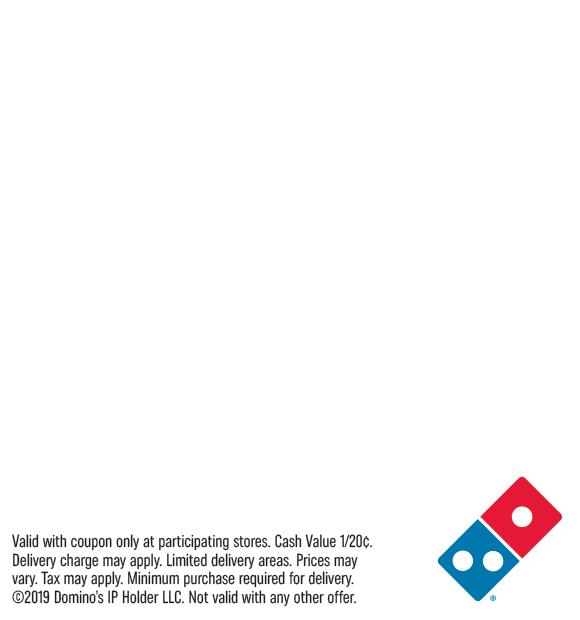 er. Pan Pizza Extra. Not valid with Bulldog Bucks or Dining Dollars. er. No Double Topping. Not valid with Bulldog DOUBLE DEAL Two Large 2-Topping FAMILY PACK 2 - 12” 1-Topping,Cinna-Stix, 16 Parm Bites and 2-Liter 1999 1999 CHOOSE ANY + TAX + TAX ORDER AT DOMINOS.COM SIGN UP FOR DOMINO’S PIECE OF THE PIE REWARDS® AT DOMINOS.COM/REWARDSADRIAN 517-263-0678 1113 W. Beecher St. LARGE 14” 5-TOPPING PIZZA $ FAMILY PACK 2 - 12” 1-Topping,Cinna-Stix, 16 Parm Bites and 2-Liter CHOOSE ANY 2 OR MORE Marbled Cookie Brownie • Specialty RPF1361 *Domino’s Piece of the Pie Rewards® program is open only to U.S. residents 13+ with a Pizza Pro le account who order from participating Domino’s locations. Point redemption only valid online toward a free medium 2-topping pizza at participating locations. Only one order of $10 or more excluding gratuities and donations per calendar day can earn points. For complete details visit dominos.com/rewards. Any delivery charge is not a tip paid to your driver. Drivers carry less than $20. Tax may apply. Prices, participation, delivery area and charges may vary. Returned checks, along with the state’s maximum allowable returned check fee, may be electronically presented to your bank. ©2019 Domino’s IP Holder LLC. Domino’s®, Domino’s Pizza®, Piece of the Pie Rewards® and the modular logo are registered trademarks of Domino’s IP Holder LLC. ess than d check dular log cararry reeturne t the mo ORDER AT DOMINOS.COM SIGN UP FOR DOMINO’S PIECE OF THE PIE REWARDS AT DOMINOS.COM/REWARDS THE ONLY THING BETTER THAN PIZZA? FREE 2-TOPPING PIZZA 9/19 3:48 P CHOOSE ANY 2 OR MORE LARGE 14” 5-TOPPING PIZZA FAMILY PACK 10” DEAL Valid with coupon only at participating stores. Cash Value 1/20¢. Delivery charge may apply. Limited delivery areas. Prices may vary. Tax may apply. Minimum purchase required for delivery. ©2020 Domino’s IP Holder LLC. Not valid with any other o er. Valid with coupon only at participating stores. Cash Value 1/20¢. Delivery charge may apply. Limited delivery areas. Prices may vary. Tax may apply. Minimum purchase required for delivery. ©2020 Domino’s IP Holder LLC. Not valid with any other o er. Valid with coupon only at participating stores. Cash Value 1/20¢. Delivery charge may apply. Limited delivery areas. Prices may vary. Tax may apply. Minimum purchase required for delivery. ©2020 Domino’s IP Holder LLC. Not valid with any other o er. Valid with coupon only at participating stores. Cash Value 1/20¢. Delivery charge may apply. Limited delivery areas. Prices may vary. Tax may apply. Minimum purchase required for delivery. ©2020 Domino’s IP Holder LLC. Not valid with any other o er. Dominoʼs Marbled Cookie BrownieTM • Specialty Chicken • Medium 2-Topping Pizza • Oven Baked Sandwiches Stuffed Cheesy Bread 8pc Chicken Side • Penne Pasta • Salad Two 12” 1-Topping Pizzas, Cinnamon Bread Twists, 16 Parmesan Bread Bites & 2-Liter Small 10” 2-Topping Pizza Carryout Only. $599 EACH $19 99 + TAX $9 99 + TAX $599 + TAX Merry Christmas Relish this day with delicious pizza