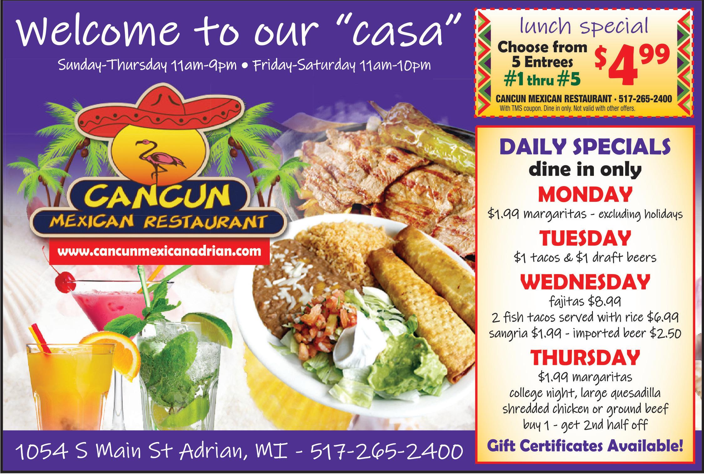 ENJ Y A NIGHT IN. Local restaurants o ering carryout and/or delivery. NAME OF RESTAURANT WEBSITE PHONE CARRYOUT DELIVERY CURBSIDE /DRIVE THRU Aubree’s Pizzeria & Grill 1329 S. Main St • Adrian, MI 49221 aubrees.com 517.438.8367 Chomp Burger 240 N. Main St. • Adrian, MI 49221 chompburgeradrian.com 517.438.8384 JR’s Grill and Bar 1368 Division St • Adrian, MI 49221 jrsgrillandpub.com 517.920.4756 Little Caesars Pizza 1540 W. Maumee St • Adrian, MI 49221 littlecaesars.com 517.759.3300 CANCUN MEXICAN RESTAURANCT • 517-265-2400 With TMS coupon. Not valid with other offers. Exp. 1/15/21 $5 OFF $40 your dine-in or take-out order Don’t forget to purchase your MARGARITA TO-GO with your take-out order