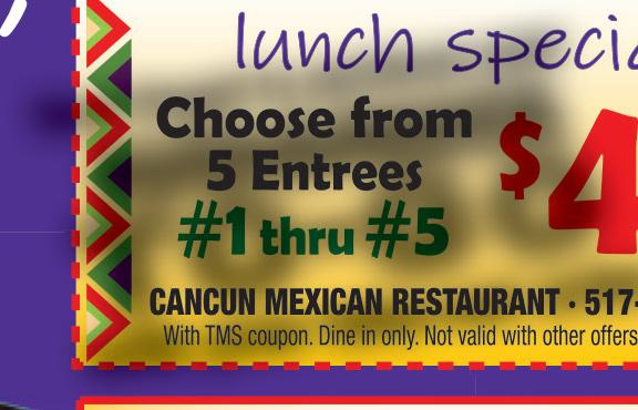 Don’t forget to purchase your MARGARITA TO - GO with your take-out order CANCUN MEXICAN RESTAURANCT • 517-265-2400 With TMS coupon. Dine in only. Not valid with other offers. Exp. 12/15/20 $5 OFF ANY PURCHASE OF $30 OR MORE $1 OFF ANY LUNCH ITEM LUNCH SPECIAL 11AM-3PM CANCUN MEXICAN RESTAURANCT • 517-265-2400 With TMS coupon. Dine in only. Not valid with other offers. Exp. 12/15/20 CANCUN MEXICAN RESTAURANCT • 517-265-2400 With TMS coupon. Dine in only. Not valid with other offers. Exp. 12/15/20 $3 OFF PITCHER OF MARGARITAS On Sale Now! HOLIDAY GIFT CERTIFICATES Buy $40 Certificate - Get $5 FREE Buy $60 Certificate - Get $10 FREE ATTENTION BUSINESS OWNERS DON’T HIRE ADDITIONAL STAFF TO CLEAN AND SANITIZE YOUR WORKPLACE... HIRE US! DON’T STRESS, WE WILL CLEAN THE MESS $25 OFF $25 OFF $25 OFF Deep Cleaning Service Additional Cleaning Service Must present coupon. Not valid with any other offer. Expires 12/15/20 Must present coupon. Not valid with any other offer. Expires 12/15/20 Must present coupon. Not valid with any other offer. Expires 12/15/20 Current Customers. Valid for any cleaning in addition to previously scheduled regular cleaning. ServicesAvailable Weekly • Bi-Weekly • Monthly Real Estate Showings • One-Time Occaisional • Move-in/Move-out Residential or Commercial We Service Most of Southeast Michigan! SENIORS GET 15% OFF One-time AND Recurring Cleanings Call Us For a Free Quote Today! 517-673-1404 Recurring Cleaning Service New Customers Only. Valid on 3rd visit only.