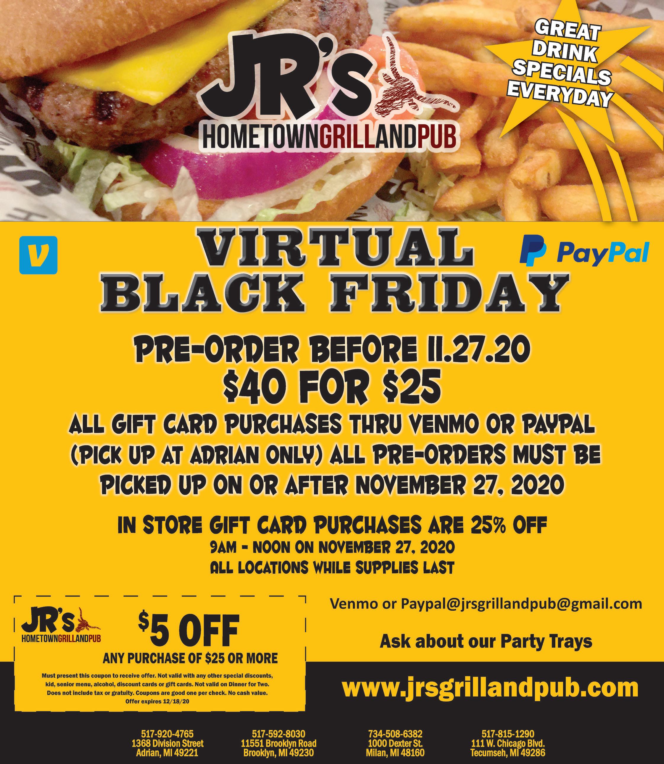 113 E Maumee St. Adrian, MI 49221 517-920-4291 @hooligansgrill FIND US ON Downtown Adrian Shhhhhhh..... Best kept secret in Michigan! Fresh, clean & Homegrown Valid Thursdays – Sundays only. Good toward food only. Excludes Alcoholic beverages. Must present coupon to receive o er. Not valid with any other special discounts, kids, alcohol, or gift cards. Dine in only. Does not include tax or gratuity. Coupons are good one per check, no cash value. O er expires 12/15/20 Valid Thursdays – Sundays only. Good toward food only. Excludes Alcoholic beverages. Must present coupon to receive o er. Not valid with any other special discounts, kids, alcohol, or gift cards. Dine in only. Does not include tax or gratuity. Coupons are good one per check, no cash value. O er expires 12/15/20 With any Entrée Beer Battered Fish FREE APPETIZER BUY ONE GET ONE FREE AMERICA’S PREMIER HUNTING & OUTDOORSMAN BOOT RED WING & IRISH SETTER - ALWAYS ON THE HUNT AMERICA’S PREMIER HUNTING & OUTDOORSMAN BOOT AMERICA’S PREMIER HUNTING & OUTDOORSMAN BOOT 507 College Ave • Adrian 517-759-3170 • M-F 8-5 Sat 8-12 @TheeOldMill SHOP HERE ON BLACK FRIDAY SAVE $20 Any Red Wing or Irish Setter Boots